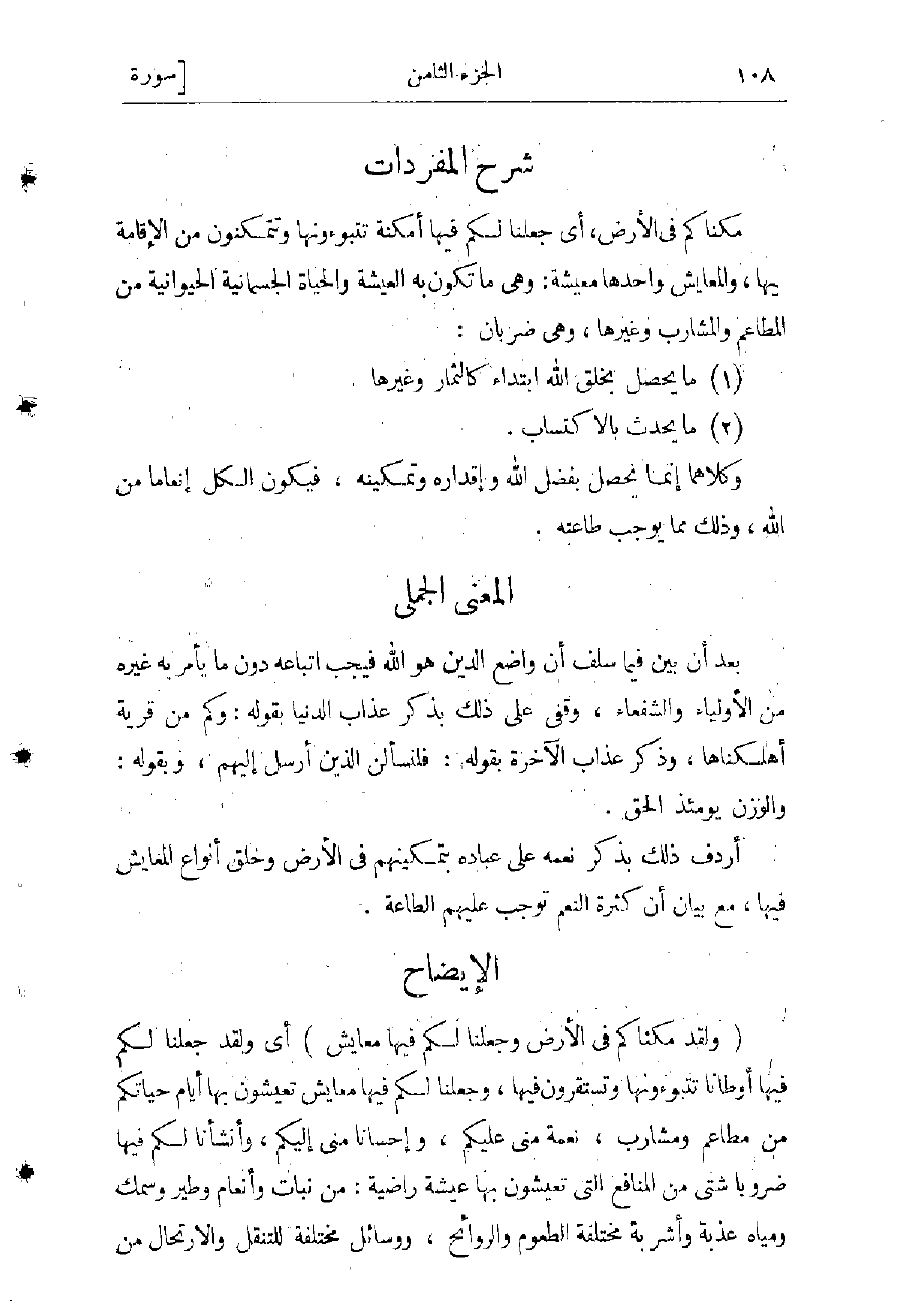 مكناكم فى الأرض، أي جعلنا لكم فيها أمكنة تتبوءونها وتتمكنون من الإقامة فيها، والمعايش واحدها معيشة: وهى ما تكون به العيشة والحياة الجسمانية الحيوانية من المطاعم والمشارب وغيرها، وهى ضربان: