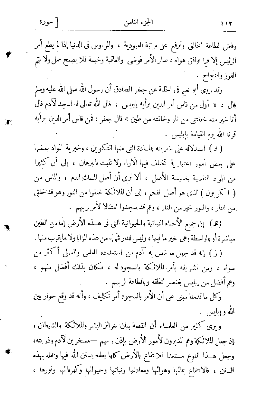 (د) استدلاله على خيريته بالمادة التي منها التكوين، وخيرية الموادّ بعضها على بعض أمور اعتبارية تختلف فيها الآراء ولا تثبت بالبرهان، إلى أن كثيرا من الموادّ النفسية خسيسة الأصل، ألا ترى أن أصل المسك الدم، والماس من (الكربون) الذي هو أصل الفحم، إلى أن الملائكة خلقوا من النور وهو قد خلق من النار، والنور خير من النار، وهم قد سجدوا امتثالا لأمر ربهم.