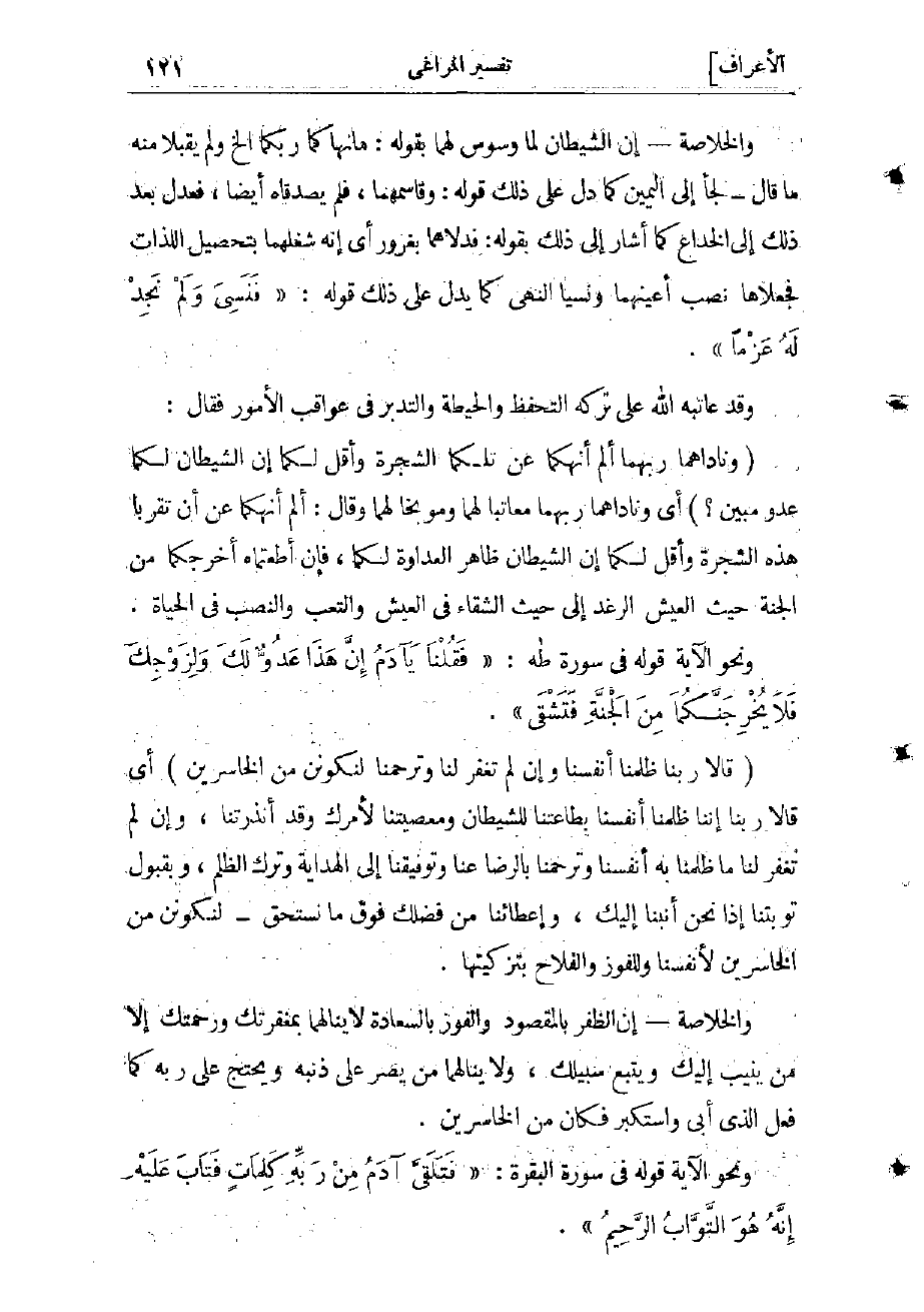(قالا رَبَّنا ظَلَمْنا أَنْفُسَنا وَإِنْ لَمْ تَغْفِرْ لَنا وَتَرْحَمْنا لَنَكُونَنَّ مِنَ الْخاسِرِينَ) أي قالا ربنا إننا ظلمنا أنفسنا بطاعتنا للشيطان ومعصيتنا لأمرك وقد أنذرتنا، وإن لم تغفر لنا ما ظلمنا به أنفسنا وترحمنا بالرضا عنا وتوفيقنا إلى الهداية وترك الظلم، وبقبول توبتنا إذا نحن أنبنا إليك، وإعطائنا من فضلك فوق ما نستحق- لنكونن من الخاسرين لأنفسنا وللفوز والفلاح بتزكيتها.