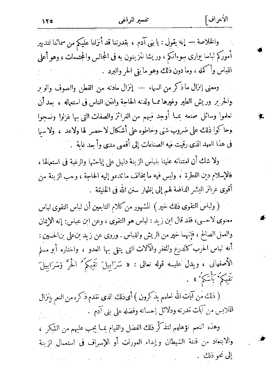 (وَلِباسُ التَّقْوى ذلِكَ خَيْرٌ) المشهور من كلام التابعين أن لباس التقوى لباس معنوى لاحسى، فقد قال ابن زيد: لباس هو التقوى وعن ابن عباس: إنه الإيمان والعمل الصالح، فإنهما خير من الريش واللباس. وروى عن زيد بن على بن الحسين: أنه لباس الحرب كالدّرع والمغفر والآلات التي يتّقي بها العدو، واختاره أبو مسلم الأصفهانى، ويدل عليه قوله تعالى: «سَرابِيلَ تَقِيكُمُ الْحَرَّ. وَسَرابِيلَ تَقِيكُمْ بَأْسَكُمْ» .