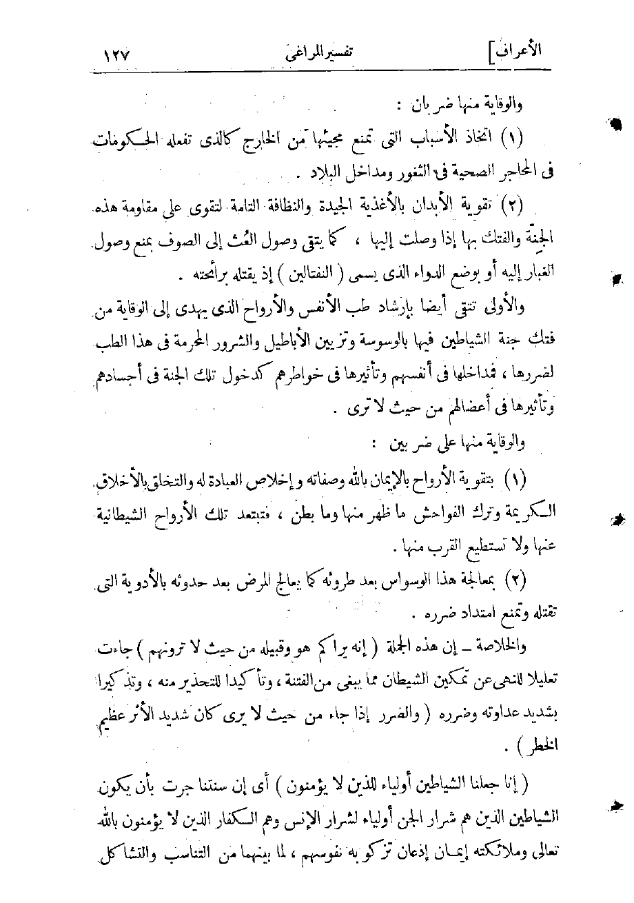 (2) تقوية الأبدان بالأغذية الجيدة والنظافة التامة لتقوى على مقاومة هذه الجنّة والفتك بها إذا وصلت إليها، كما يتقى وصول العثّ إلى الصوف بمنع وصول الغبار إليه أو بوضع الدواء الذي يسمى (النفتالين) إذ يقتله برائحته.