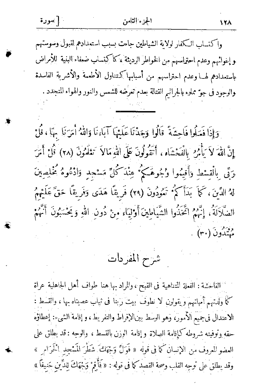الفاحشة: الفعلة المتناهية فى القبح، والمراد بها هنا طواف أهل الجاهلية عراة كما ولدتهم أمهاتهم ويقولون: لا نطوف بيت ربنا فى ثياب عصيناه بها، والقسط: