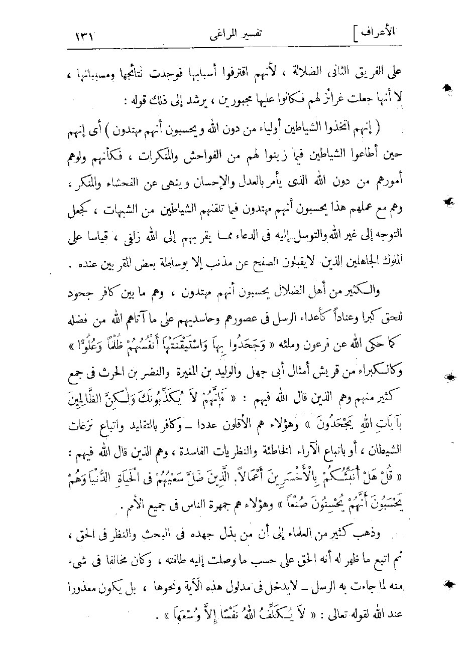 والكثير من أهل الضلال يحسبون أنهم مهتدون، وهم ما بين كافر جحود للحق كبرا وعنادا كأعداء الرسل فى عصورهم وحاسديهم على ما آتاهم الله من فضله كما حكى سبحانه عن فرعون وملئه «وَجَحَدُوا بِها وَاسْتَيْقَنَتْها أَنْفُسُهُمْ ظُلْماً وَعُلُوًّا» وكالكبراء من قريش أمثال أبي جهل والوليد بن المغيرة والنضر بن الحارث فى جميع كثير منهم وهم الذين قال الله فيهم: «فَإِنَّهُمْ لا يُكَذِّبُونَكَ وَلكِنَّ الظَّالِمِينَ بِآياتِ اللَّهِ يَجْحَدُونَ» وهؤلاء هم الأقلون عددا- وكافر بالتقليد واتباع نزغات الشيطان، أو باتباع الآراء الخاطئة والنظريات الفاسدة، وهم الذين قال الله فيهم: «قُلْ هَلْ نُنَبِّئُكُمْ بِالْأَخْسَرِينَ أَعْمالًا. الَّذِينَ ضَلَّ سَعْيُهُمْ فِي الْحَياةِ الدُّنْيا وَهُمْ يَحْسَبُونَ أَنَّهُمْ يُحْسِنُونَ صُنْعاً» وهؤلاء هم جمهرة الناس فى جميع الأمم.