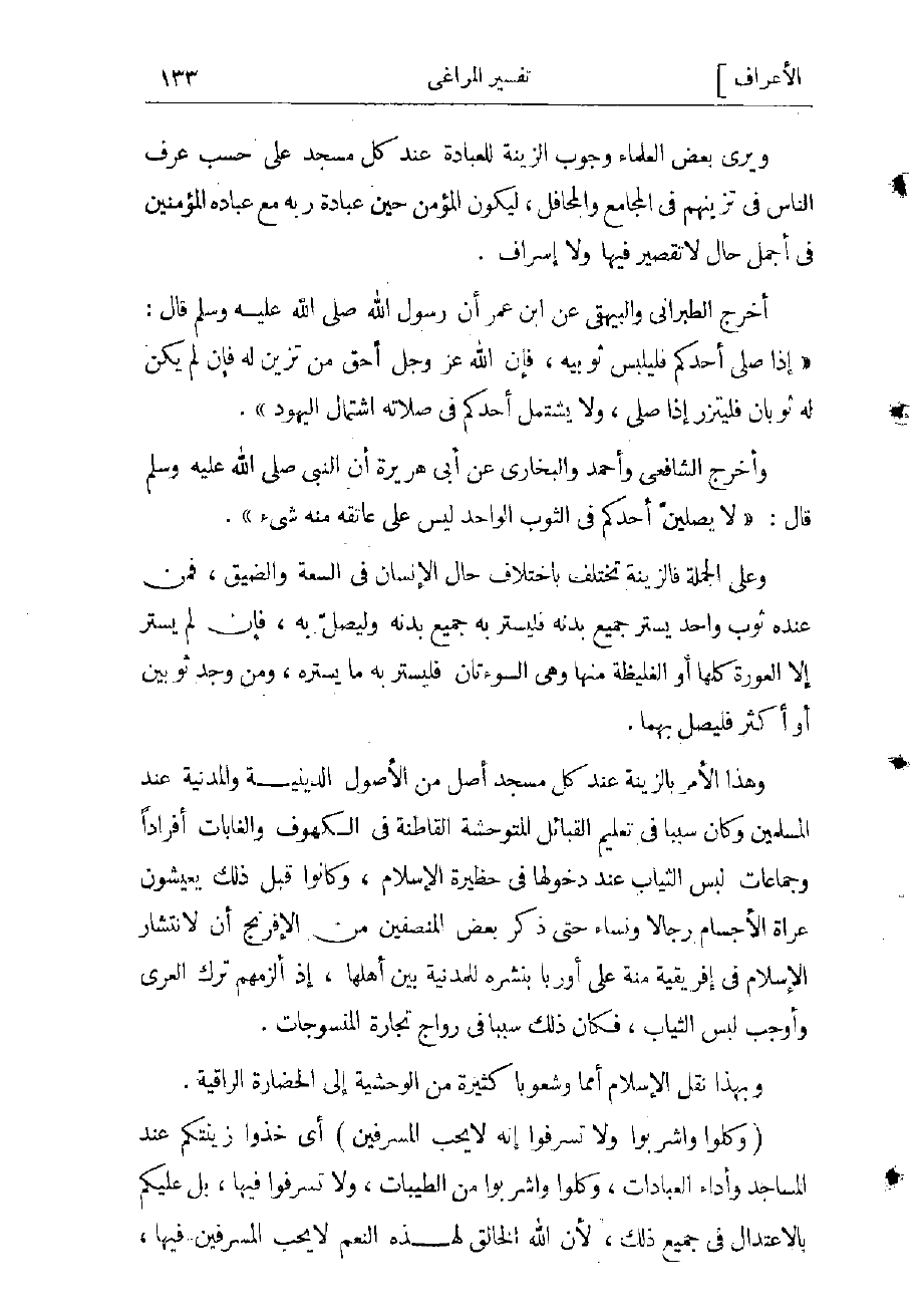 وهذا الأمر بالزينة عند كل مسجد أصل من الأصول الدينية والمدنية عند المسلمين وكان سببا فى تعليم القبائل المتوحشة القاطنة فى الكهوف والغابات أفرادا وجماعات لبس الثياب عند دخولها فى حظيرة الإسلام، وكانوا قبل ذلك يعيشون عراة الأجسام رجالا ونساء حتى ذكر بعض المنصفين من الإفرنج أنّ لانتشار الإسلام فى إفريقية منّة على أوربا بنشرة للمدنية بين أهلها، إذ ألزمهم ترك العرى وأوجب لبس الثياب فكان ذلك سببا فى رواج تجارة المنسوجات.