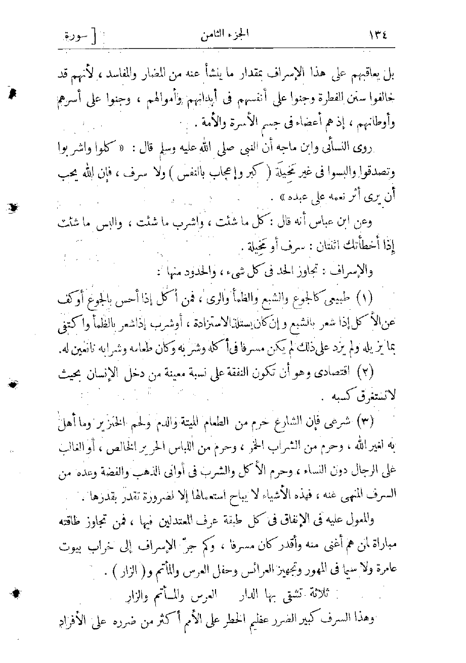 والمعول عليه فى الإنفاق فى كل طبقة عرف المعتدلين فيها، فمن تجاوز طاقته مباراة لمن هم أغنى منه وأقدر كان مسرفا، وكم جرّ الإسراف إلى خراب بيوت عامرة ولا سيما فى المهور وتجهيز العرائس وحفل العرس والمأتم و (الزار) .