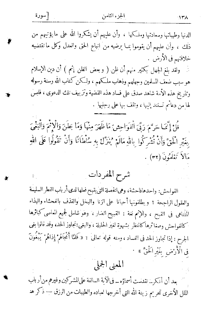 قُلْ إِنَّما حَرَّمَ رَبِّيَ الْفَواحِشَ ما ظَهَرَ مِنْها وَما بَطَنَ وَالْإِثْمَ وَالْبَغْيَ بِغَيْرِ الْحَقِّ وَأَنْ تُشْرِكُوا بِاللَّهِ ما لَمْ يُنَزِّلْ بِهِ سُلْطاناً وَأَنْ تَقُولُوا عَلَى اللَّهِ ما لا تَعْلَمُونَ (33)