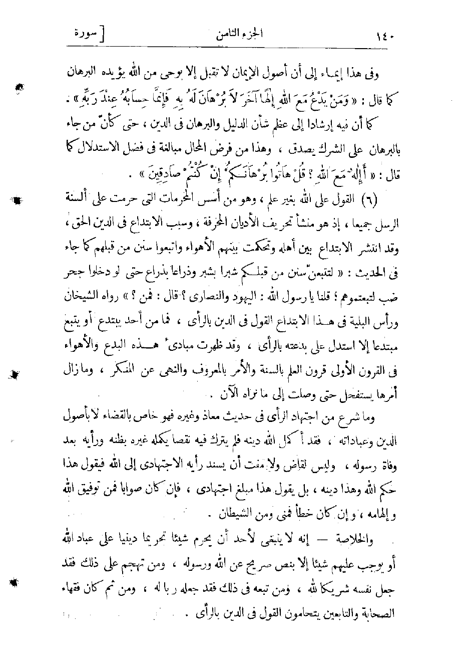 ورأس البلية فى هذا الابتداع القول فى الدين بالرأى، فما من أحد يبتدع أو يتبع مبتدعا إلا استدل على بدعته بالرأى، وقد ظهرت مبادئ هذه البدع والأهواء فى القرون الأولى قرون العلم بالسنة والأمر بالمعروف والنهى عن المنكر، وما زال أمرها يستفحل حتى وصلت إلى ما نراه الآن.