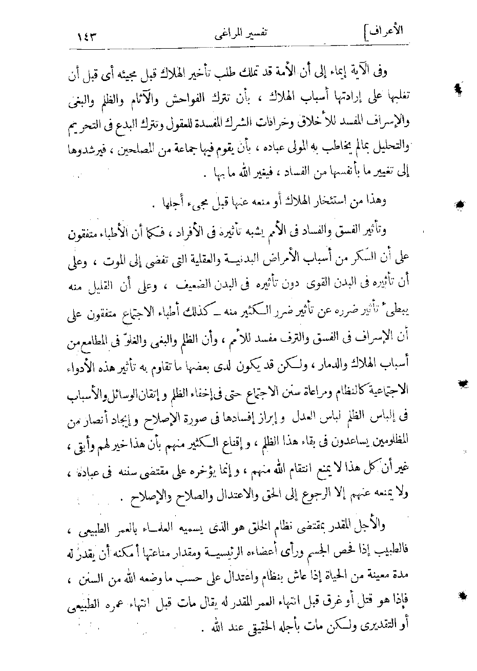 وتأثير الفسق والفساد فى الأمم يشبه تأثيره فى الأفراد، فكما أن الأطباء متفقون على أن السكر من أسباب الأمراض البدنية والعقلية التي تفضى إلى الموت، وعلى أن تأثيره فى البدن القوىّ دون تأثيره فى البدن الضعيف، وعلى أن القليل منه يبطىء تأثير ضرره عن تأثير ضرر الكثير منه- كذلك أطباء الاجتماع متفقون على أن الإسراف فى الفسق والترف مفسد للأمم، وأن الظلم والبغي والغلوّ فى المطامع من أسباب الهلاك والدمار، ولكن قد يكون لدى بعضها ما تقاوم به تأثير هذه الأدواء الاجتماعية كالنظام ومراعاة سنن الاجتماع حتى فى إخفاء الظلم وإتقان الوسائل والأسباب فى إلباس العدل وإبراز إفسادها فى صورة الإصلاح وإيجاد أنصار من المظلومين يساعدون فى بقاء هذا الظلم، وإقناع الكثير منهم بأن هذا خير لهم وأبقى، غير أن كل هذا لا يمنع انتقام الله منهم، وإنما يؤخره على مقتضى سننه فى عباده، ولا يمنعه عنهم إلا الرجوع إلى الحق والاعتدال والصلاح والإصلاح.