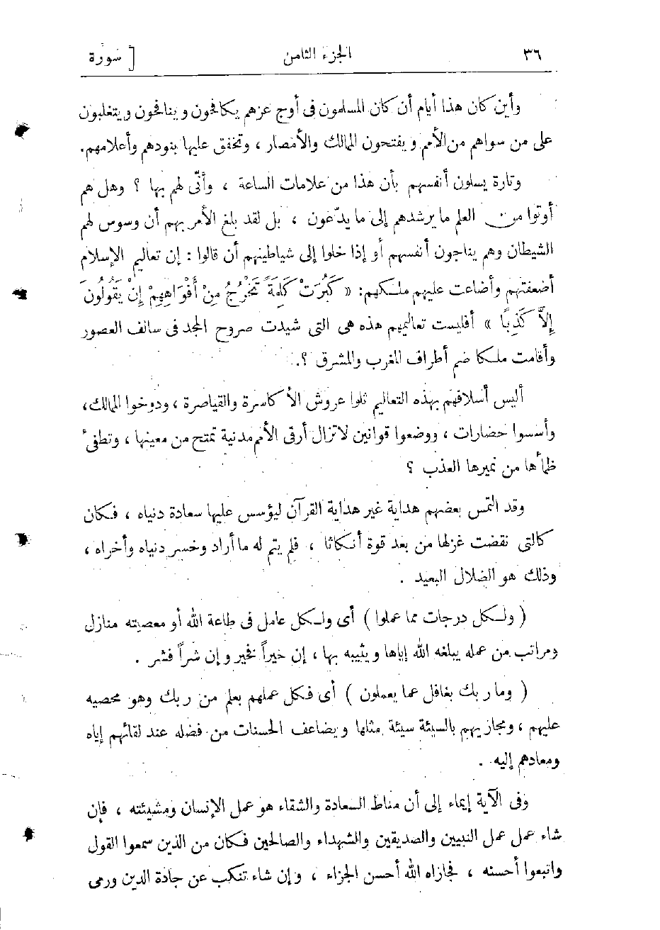 العلم ما يرشدهم إلى ما يدّعون، بل لقد بلغ الأمر بهم أن وسوس لهم الشيطان وهم يناجون أنفسهم، أو إذا خلوا إلى شياطينهم أن قالوا إن تعاليم الإسلام أضعفنهم وأضاعت عليهم ملكهم: «كَبُرَتْ كَلِمَةً تَخْرُجُ مِنْ أَفْواهِهِمْ إِنْ يَقُولُونَ إِلَّا كَذِباً» أفليست تعاليمهم هذه هى التي شيّدت صروح المجد فى سالف العصور، وأقامت ملكا ضم أطراف المغرب والمشرق؟