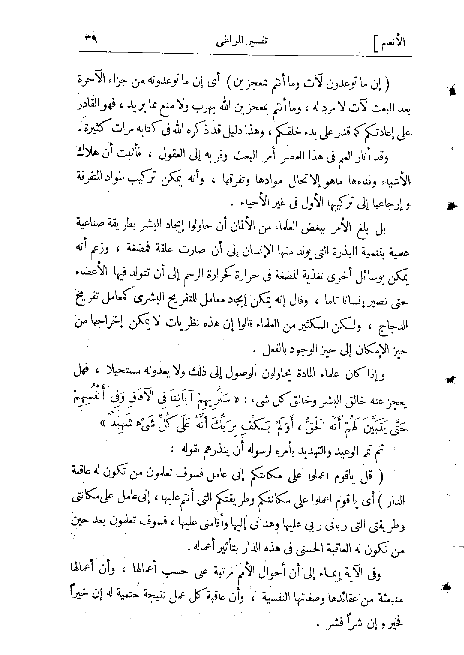 وقد أنار العلم فى هذا العصر أمر البعث وقرّبه إلى العقول، فأثبت أن هلاك الأشياء وفناءها ما هو إلا تحلل موادها وتفرقها، وأنه يمكن تركيب المواد المتفرقة وإرجاعها إلى تركيبها الأول فى غير الأحياء.