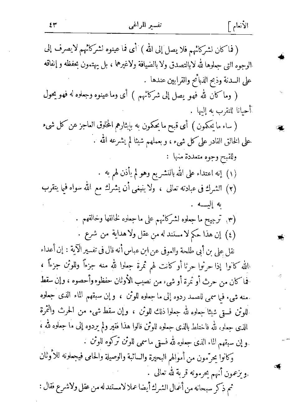 نقل على بن أبي طلحة والعوفى عن ابن عباس أنه قال فى تفسير الآية: إن أعداء، الله كانوا إذا حرثوا حرثا أو كانت لهم ثمرة جعلوا لله منه جزءا وللوثن جزءا، فما كان من حرث أو ثمرة أو شىء من نصيب الأوثان حفظوه وأحصوه، وإن سقط منه شىء فيما سمى للصمد ردوه إلى ما جعلوه للوثن، وإن سبقهم الماء الذي جعلوه للوثن فسقى شيئا جعلوه لله جعلوا ذلك للوثن، وإن سقط شىء من الحرث والثمرة الذي جعلوه لله فاختلط بالذي جعلوه للوثن قالوا هذا فقير ولم يردوه إلى ما جعلوه لله، وإن سبقهم الماء الذي جعلوه لله فسقى ما سمى للوثن تركوه للوثن.