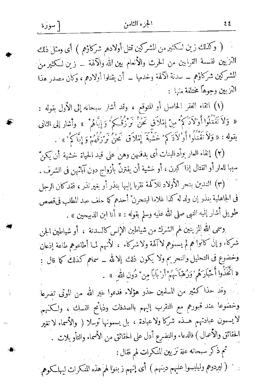 (وَكَذلِكَ زَيَّنَ لِكَثِيرٍ مِنَ الْمُشْرِكِينَ قَتْلَ أَوْلادِهِمْ شُرَكاؤُهُمْ) أي ومثل ذلك التزيين لقسمة القرابين من الحرث والأنعام بين الله والآلهة- زيّن لكثير من المشركين شركاؤهم- سدنة الآلهة وخدمها- أن يقتلوا أولادهم. وكان مصدر هذا التزيين وجوها مختلفة منها: