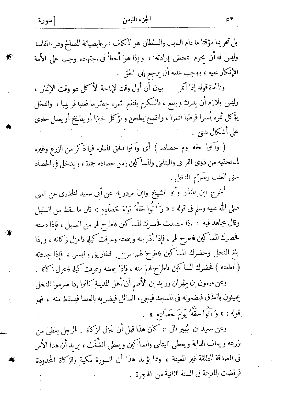 وعن سعيد بن جبير قال: كان هذا قبل أن تنزل الزكاة. الرجل يعطى من زرعه ويعلف الدابة ويعطى اليتامى والمساكين ويعطى الضّغث، يريد أن هذا الأمر فى الصدقة المطلقة غير المعينة، ومما يؤيد هذا أن السورة مكية والزكاة المحدودة فرضت بالمدينة فى السنة الثانية من الهجرة.