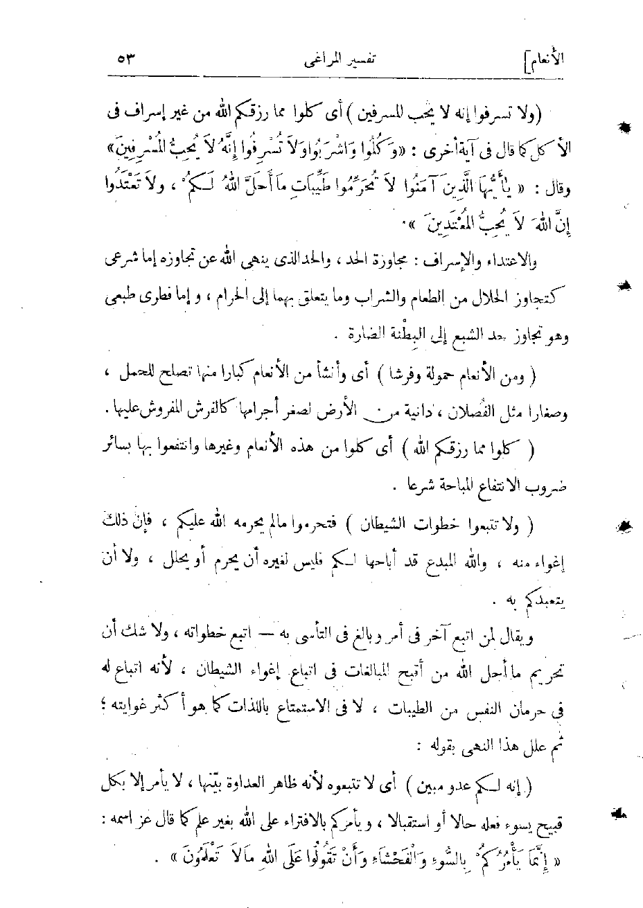 (وَلا تُسْرِفُوا إِنَّهُ لا يُحِبُّ الْمُسْرِفِينَ) أي كلوا مما رزقكم الله من غير إسراف فى الأكل كما قال فى آية أخرى: «وَكُلُوا وَاشْرَبُوا وَلا تُسْرِفُوا إِنَّهُ لا يُحِبُّ الْمُسْرِفِينَ» وقال: «يا أَيُّهَا الَّذِينَ آمَنُوا لا تُحَرِّمُوا طَيِّباتِ ما أَحَلَّ اللَّهُ لَكُمْ، وَلا تَعْتَدُوا إِنَّ اللَّهَ لا يُحِبُّ الْمُعْتَدِينَ» .