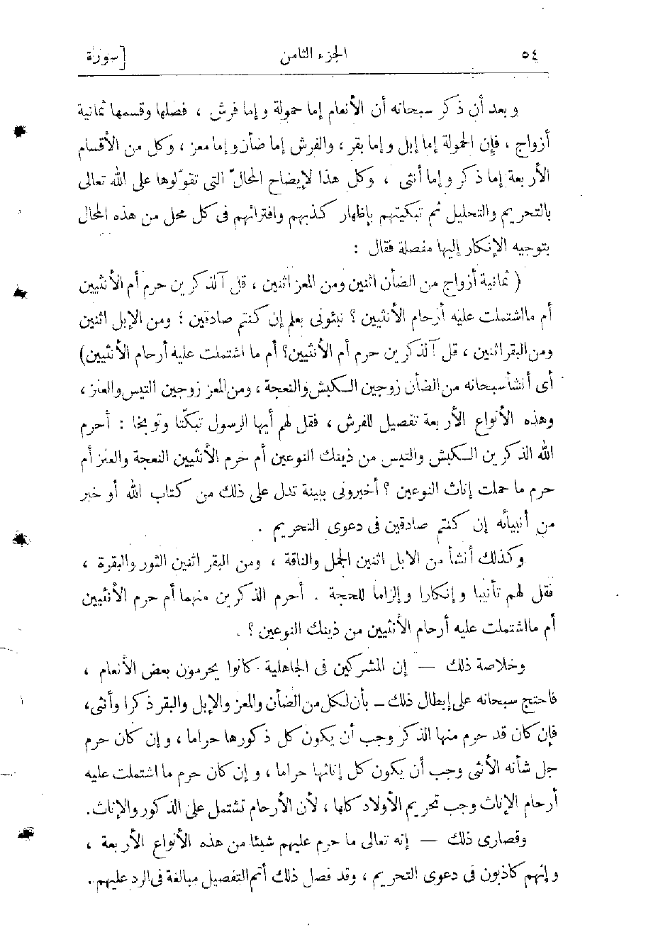 (ثَمانِيَةَ أَزْواجٍ مِنَ الضَّأْنِ اثْنَيْنِ وَمِنَ الْمَعْزِ اثْنَيْنِ، قُلْ آلذَّكَرَيْنِ حَرَّمَ أَمِ الْأُنْثَيَيْنِ أَمَّا اشْتَمَلَتْ عَلَيْهِ أَرْحامُ الْأُنْثَيَيْنِ؟ نَبِّئُونِي بِعِلْمٍ إِنْ كُنْتُمْ صادِقِينَ. وَمِنَ الْإِبِلِ اثْنَيْنِ وَمِنَ الْبَقَرِ اثْنَيْنِ، قُلْ آلذَّكَرَيْنِ حَرَّمَ أَمِ الْأُنْثَيَيْنِ؟ أَمَّا اشْتَمَلَتْ عَلَيْهِ أَرْحامُ الْأُنْثَيَيْنِ) أي أنشأ سبحانه من الضأن زوجين الكبش والنعجة، ومن المعز زوجين التيس والعنز، وهذه الأنواع الأربعة تفصيل للفرش، فقل لهم أيها الرسول تبكيتا وتوبيخا: أحرم الله الذكرين الكبش والتيس من ذينك النوعين أم حرم الأنثيين النعجة والعنز أم حرم ما حملت إناث النوعين أخبرونى ببينة تدل على ذلك من كتاب الله أو خبر من أنبيائه إن كنتم صادقين فى دعوى التحريم.