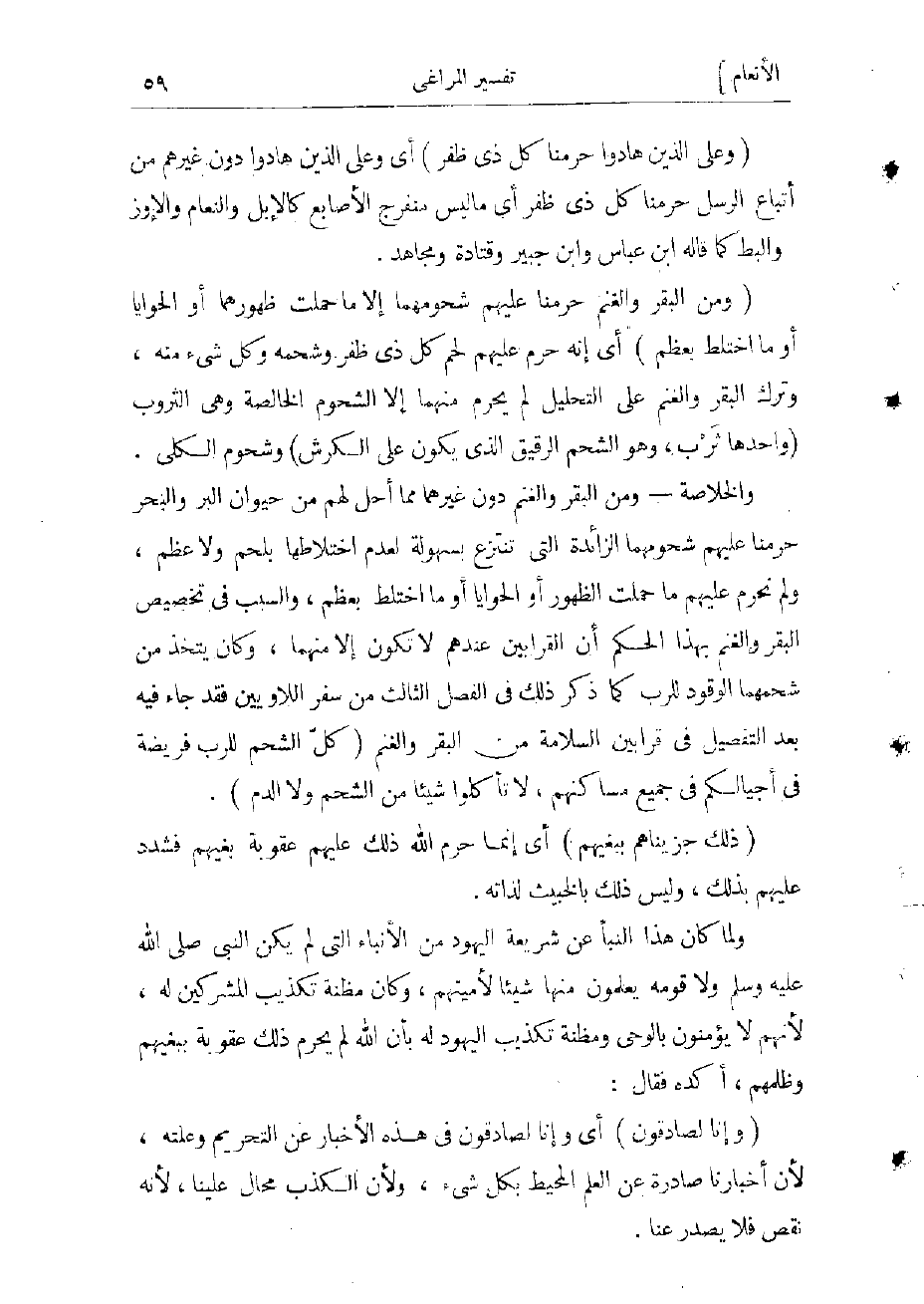 والخلاصة- ومن البقر والغنم دون غيرهما مما أحل لهم من حيوان البر والبحر حرمنا عليهم شحومهما الزائدة التي تنتزع بسهولة لعدم اختلاطها بلحم ولا عظم، ولم نحرم عليهم ما حملت الظهور أو الحوايا أو ما اختلط بعظم، والسبب فى تخصيص البقر والغنم بهذا الحكم أن القرابين عندهم لا تكون إلا منهما، وكان يتخذ من شحمهما الوقود للرب كما ذكر ذلك فى الفصل الثالث من سفر اللاويين فقد جاء فيه بعد التفصيل فى قرابين السلامة من البقر والغنم (كلّ الشحم للرب فريضة فى أجيالكم فى جميع مساكنهم، لا تأكلوا شيئا من الشحم ولا الدم.