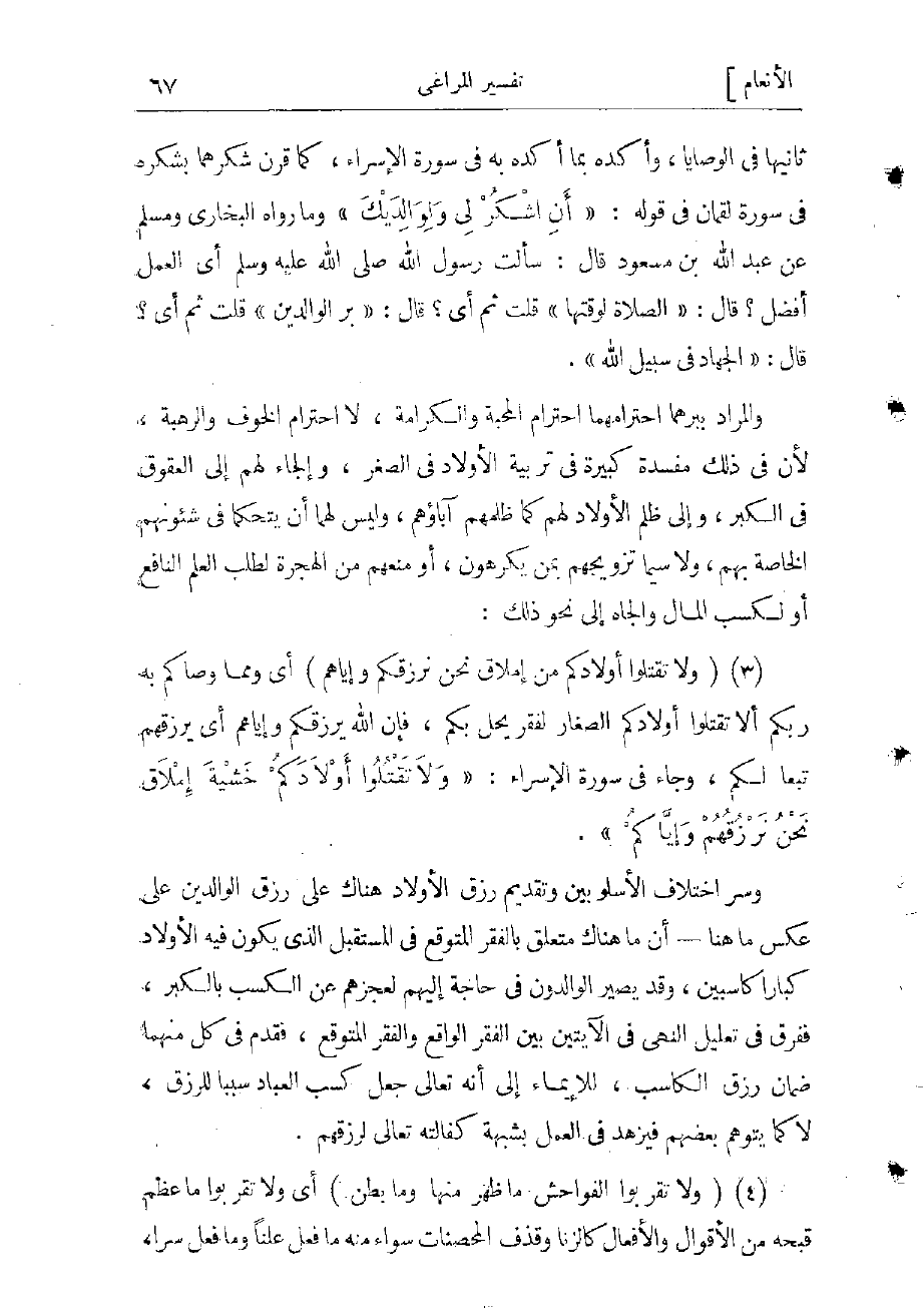 (3) (وَلا تَقْتُلُوا أَوْلادَكُمْ مِنْ إِمْلاقٍ نَحْنُ نَرْزُقُكُمْ وَإِيَّاهُمْ) أي ومما وصاكم به ربكم ألا تقتلوا أولادكم الصغار لفقر يحل بكم، فإن الله يرزقكم وإياهم أي يرزقهم تبعا لكم، وجاء فى سورة الإسراء: «وَلا تَقْتُلُوا أَوْلادَكُمْ خَشْيَةَ إِمْلاقٍ نَحْنُ نَرْزُقُهُمْ وَإِيَّاكُمْ» وسر اختلاف الأسلوبين وتقديم رزق الأولاد هناك على رزق الوالدين على عكس ما هنا- أن ما هناك متعلق بالفقر المتوقع فى المستقبل الذي يكون فيه الأولاد كبارا كاسبين، وقد يصير الوالدون فى حاجة إليهم لعجزهم عن الكسب بالكبر، ففرّق فى تعليل النهى فى الآيتين بين الفقر الواقع والفقر المتوقع فقدم فى كل منهما ضمان رزق الكاسب، للإيماء إلى أنه تعالى جعل كسب العباد سببا للرزق، لا كما يتوهم بعضهم فيزهد فى العمل بشبهة كفالته تعالى لرزقهم.