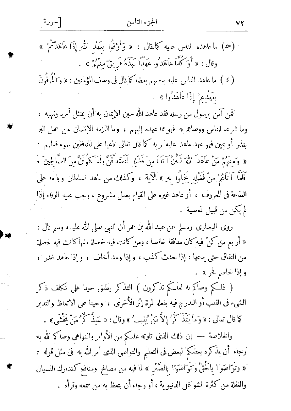 فمن آمن برسل من رسله فقد عاهد الله حين الإيمان به أن يمتثل أمره ونهيه، وما شرعه للناس ووصاهم به فهو مما عهده إليهم، وما التزمه الإنسان من عمل البر بنذر أو يمين فهو عهد عاهد عليه ربه كما قال تعالى ناعيا على المنافقين سوء فعلهم: «وَمِنْهُمْ مَنْ عاهَدَ اللَّهَ لَئِنْ آتانا مِنْ فَضْلِهِ لَنَصَّدَّقَنَّ وَلَنَكُونَنَّ مِنَ الصَّالِحِينَ، فَلَمَّا آتاهُمْ مِنْ فَضْلِهِ بَخِلُوا بِهِ» الآية، وكذلك من عاهد السلطان وبايعه على الطاعة فى المعروف، أو عاهد غيره على القيام بعمل مشروع، وجب عليه الوفاء إذا لم يكن من قبيل المعصية.
