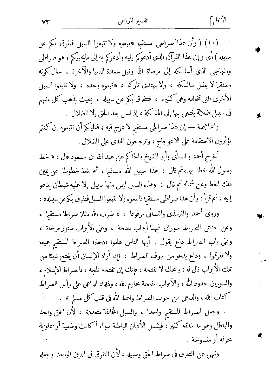 أخرج أحمد والنسائي وأبو الشيخ والحاكم عن عبد الله بن مسعود قال: «خط رسول الله خطا بيده ثم قال: هذا سبيل الله مستقيما، ثم خط خطوطا عن يمين ذلك الخط وعن شماله ثم قال: وهذه السبل ليس منها سبيل إلا عليه شيطان يدعو إليه، ثم قرأ: وَأَنَّ هذا صِراطِي مُسْتَقِيماً فَاتَّبِعُوهُ وَلا تَتَّبِعُوا السُّبُلَ فَتَفَرَّقَ بِكُمْ عَنْ سَبِيلِهِ» .