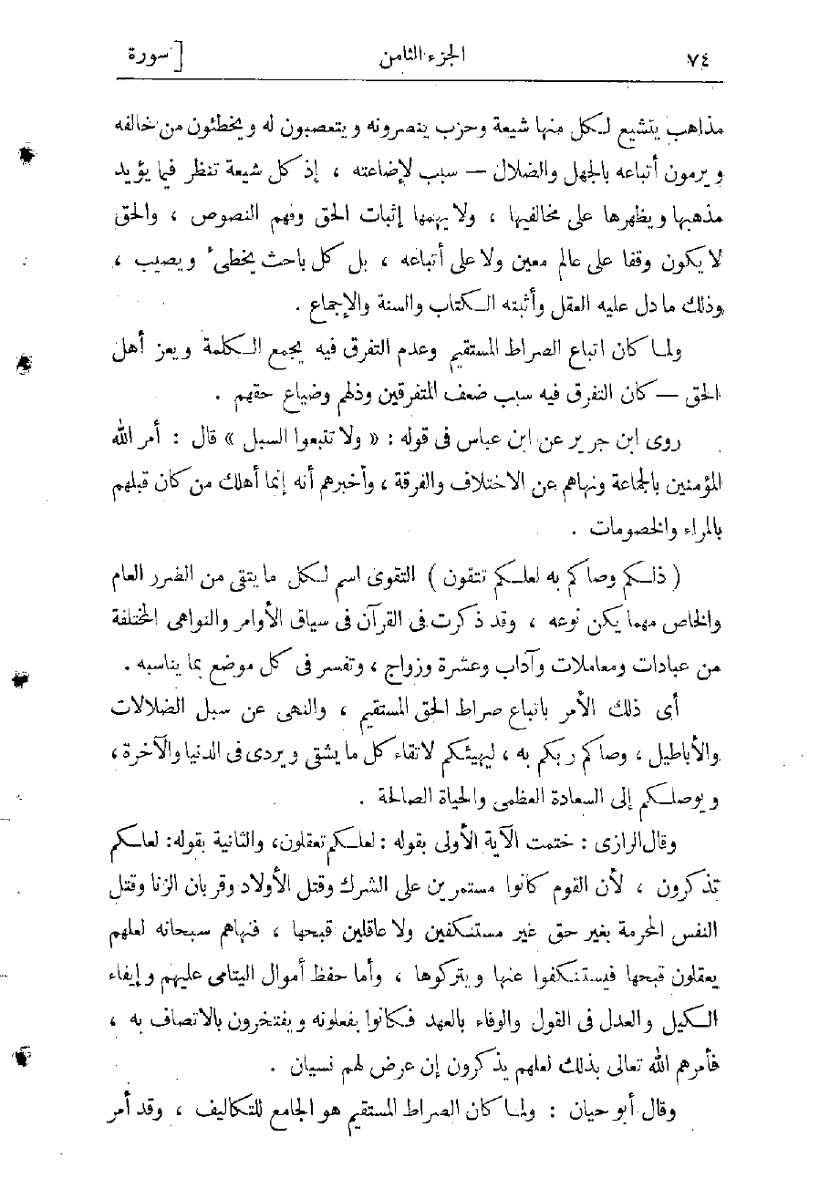 روى ابن جرير عن ابن عباس فى قوله: «وَلا تَتَّبِعُوا السُّبُلَ» قال: أمر الله المؤمنين بالجماعة ونهاهم عن الاختلاف والفرقة، وأخبرهم أنه إنما أهلك من كان قبلهم بالمراء والخصومات.