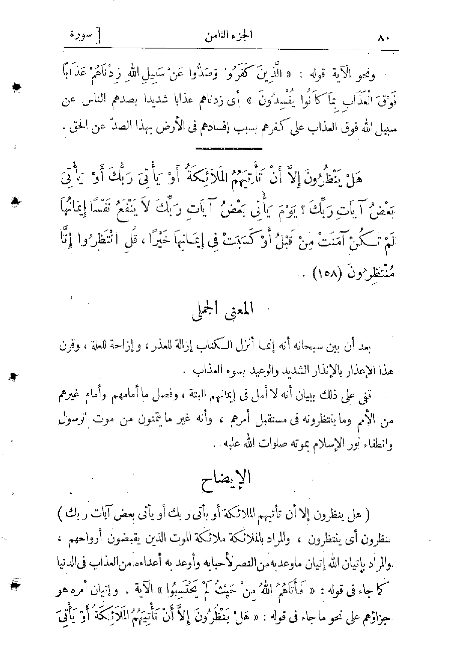 (هَلْ يَنْظُرُونَ إِلَّا أَنْ تَأْتِيَهُمُ الْمَلائِكَةُ أَوْ يَأْتِيَ رَبُّكَ أَوْ يَأْتِيَ بَعْضُ آياتِ رَبِّكَ) ينظرون أي ينتظرون، والمراد بالملائكة ملائكة الموت الذين يقبضون أرواحهم، والمراد بإتيان الله إتيان ما وعد به من النصر لأحبابه وأوعد به أعداءه من العذاب فى الدنيا كما جاء فى قوله: «فَأَتاهُمُ اللَّهُ مِنْ حَيْثُ لَمْ يَحْتَسِبُوا» الآية. وإتيان أمره هو جزاؤهم على نحو ما جاء فى قوله: َلْ يَنْظُرُونَ إِلَّا أَنْ تَأْتِيَهُمُ الْمَلائِكَةُ أَوْ يَأْتِيَ