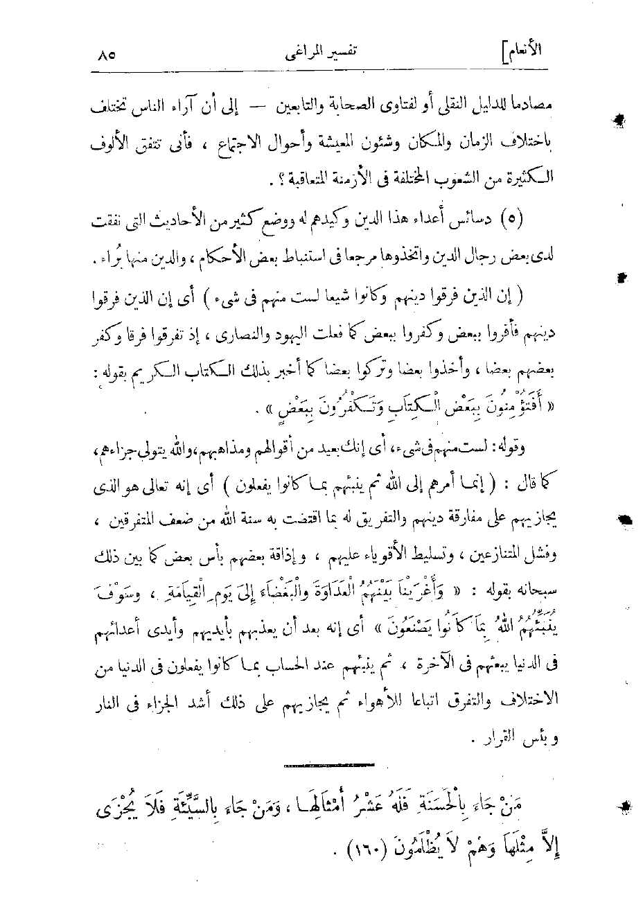 (إِنَّ الَّذِينَ فَرَّقُوا دِينَهُمْ وَكانُوا شِيَعاً لَسْتَ مِنْهُمْ فِي شَيْءٍ) أي إن الذين فرقوا دينهم فأقرّوا ببعض وكفروا ببعض كما فعلت اليهود والنصارى، إذ تفرقوا فرقا وكفّر بعضهم بعضا، وأخذوا بعضا وتركوا بعضا كما أخبر بذلك الكتاب الكريم بقوله: