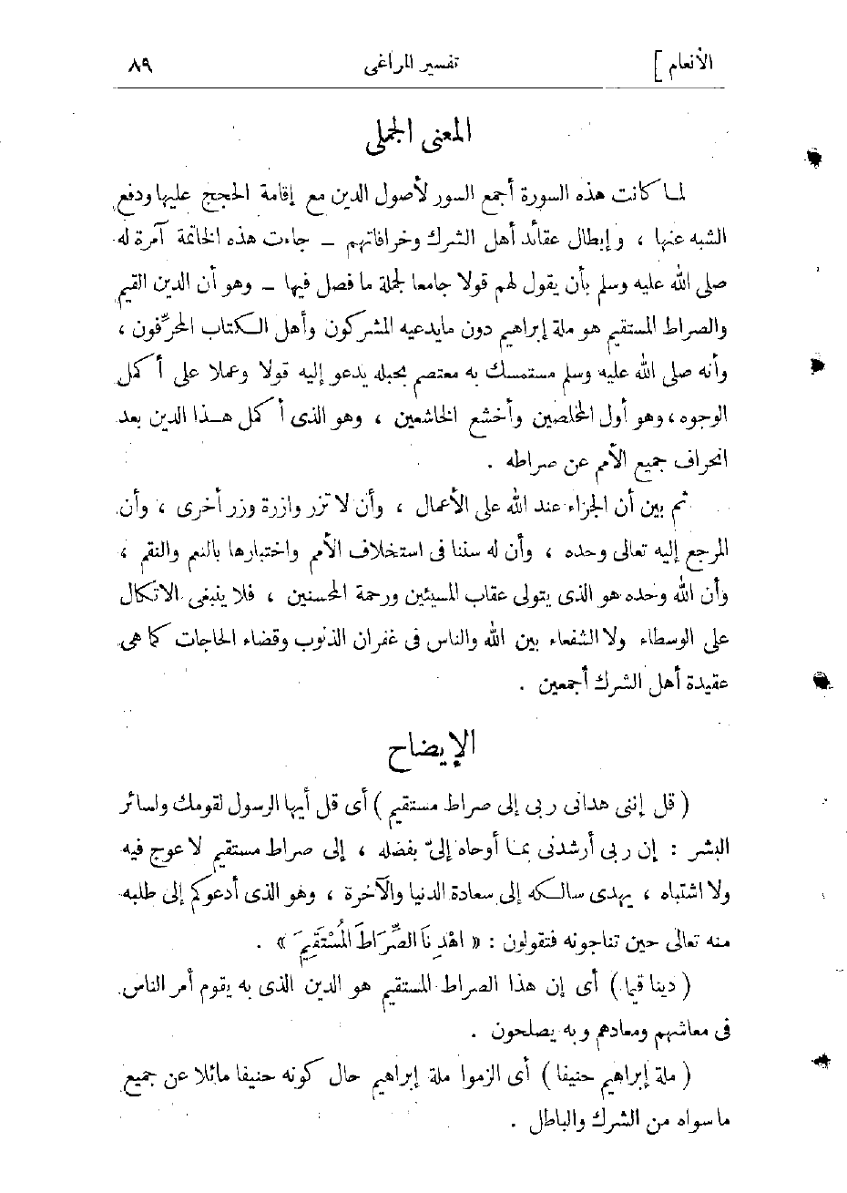 لما كانت هذه السورة أجمع السور لأصول الدين مع إقامة الحجج عليها ودفع الشبه عنها، وإبطال عقائد أهل الشرك وخرافاتهم- جاءت هذه الخاتمة آمرة له صلى الله عليه وسلم بأن يقول لهم قولا جامعا لجملة ما فصّل فيها- وهو أن الدين القيم والصراط المستقيم هو ملة إبراهيم دون ما يدعيه المشركون وأهل الكتاب المحرّفون، وأنه صلى الله عليه وسلم مستمسك به معتصم بحبله يدعو إليه قولا وعملا على أكمل الوجوه، وهو أول المخلصين وأخشع الخاشعين، وهو الذي أكمل هذا الدين بعد انحراف جميع الأمم عن صراطه.