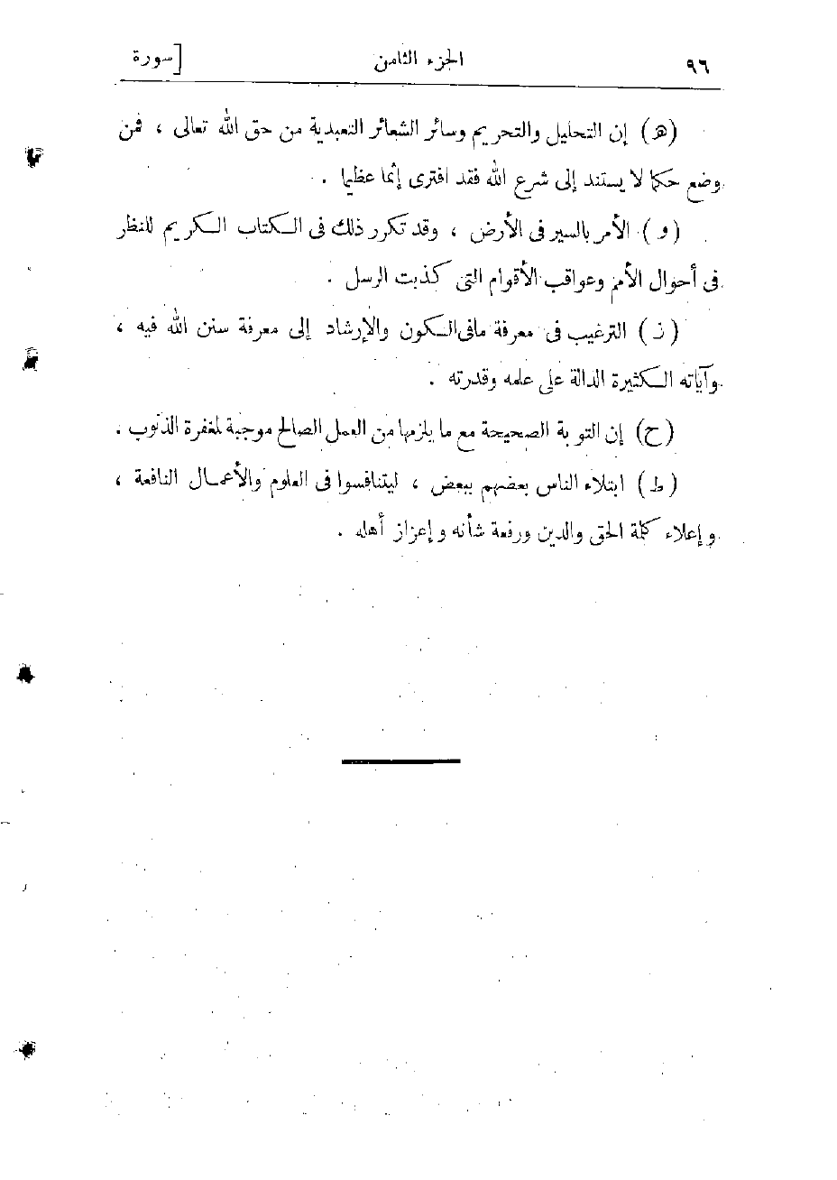 (ط) ابتلاء الناس بعضهم ببعض، ليتنافسوا فى العلوم والأعمال النافعة، وإعلاء كلمة الحق والدين ورفعة شأنه وإعزاز أهله.