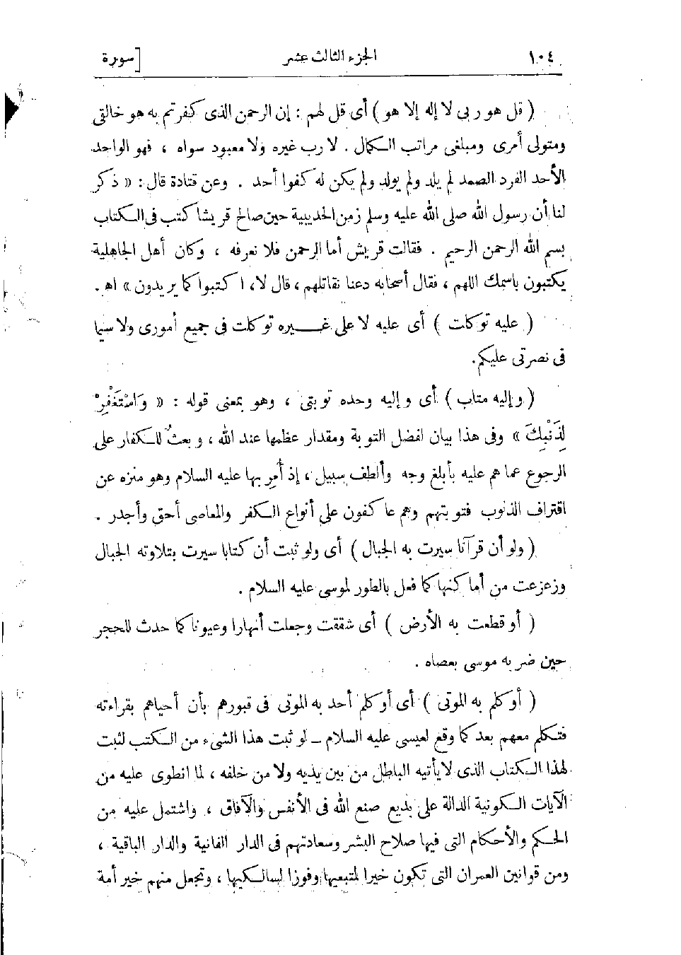(أَوْ كُلِّمَ بِهِ الْمَوْتى) أي أو كلم أحد به الموتى فى قبورهم بأن أحياهم بقراءته فتكلم معهم بعد كما وقع لعيسى عليه السلام- لو ثبت هذا الشيء من الكتب لثبت لهذا الكتاب الذي لا يأتيه الباطل من بين يديه ولا من خلفه، لما انطوى عليه من الآيات الكونية الدالة على بديع صنع الله فى الأنفس والآفاق، واشتمل عليه من الحكم والأحكام التي فيها صلاح البشر وسعادتهم فى الدار الفانية والدار الباقية، ومن قوانين العمران التي تكون خيرا لمتبعيها وفوزا لسالكيها، ويجعل منهم خير أمة أخرجت