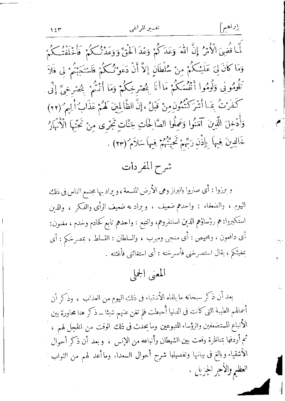 هم رؤساؤهم الذين استنفروهم، والتبع: واحدهم تابع كخادم وخدم، مغنون: أي دافعون، ومحيص: أي منجى ومهرب، والسلطان: التسلط، بمصر حكم: أي بمغيثكم، يقال استصرخنى فأصرخته: أي استغاثني فأغثته.