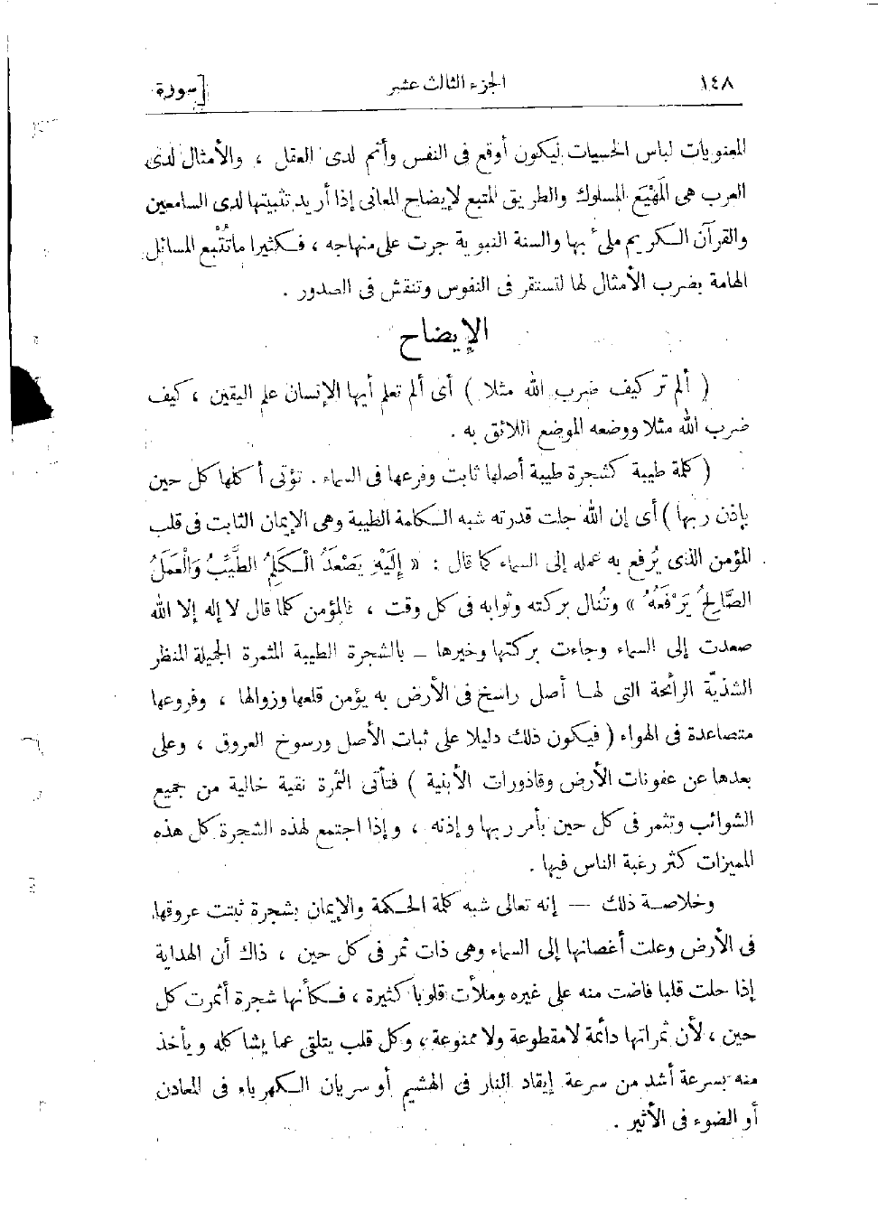 (كَلِمَةً طَيِّبَةً كَشَجَرَةٍ طَيِّبَةٍ أَصْلُها ثابِتٌ وَفَرْعُها فِي السَّماءِ. تُؤْتِي أُكُلَها كُلَّ حِينٍ بِإِذْنِ رَبِّها) أي إن الله جلت قدرته شبه الكلمة الطيبة وهى الإيمان الثابت فى قلب المؤمن الذي يرفع به عمله إلى السماء كما قال: «إِلَيْهِ يَصْعَدُ الْكَلِمُ الطَّيِّبُ وَالْعَمَلُ الصَّالِحُ يَرْفَعُهُ» وتنال بركته وثوابه فى كل وقت، فالمؤمن كلما قال لا إله إلا الله صعدت إلى السماء وجاءت بركتها وخيرها- بالشجرة الطيبة المثمرة الجميلة المنظر الشذّية الرائحة التي لها أصل راسخ فى الأرض به يؤمن قلعها وزوالها، وفروعها متصاعدة فى الهواء (فيكون ذلك دليلا على ثبات الأصل ورسوخ العروق، وعلى بعدها عن عفونات الأرض وقاذورات الأبنية) فتأتى الثمرة نقية خالية من جميع الشوائب، وتثمر فى كل حين بأمر ربها وإذنه، وإذا اجتمع لهذه الشجرة كل هذه المميزات كثر رغبة الناس فيها.