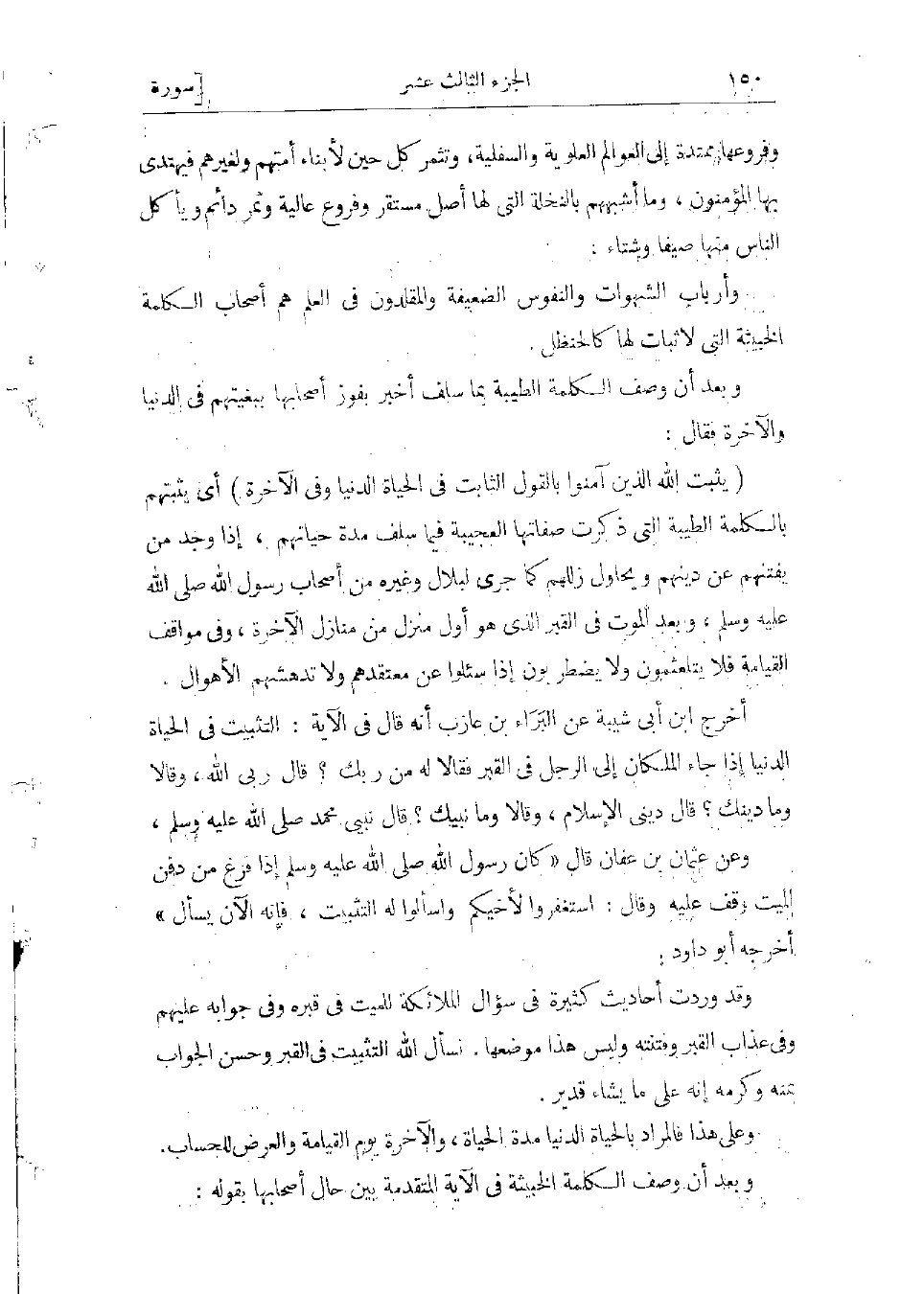 وقد وردت أحاديث كثيرة فى سؤال الملائكة للميت فى قبره وفى جوابه لهم، وفى عذاب القبر وفتنته وليس هذا موضعها. نسأل الله التثبيت فى القبر وحسن الجواب بمنه وكرمه، إنه على ما يشاء قدير.