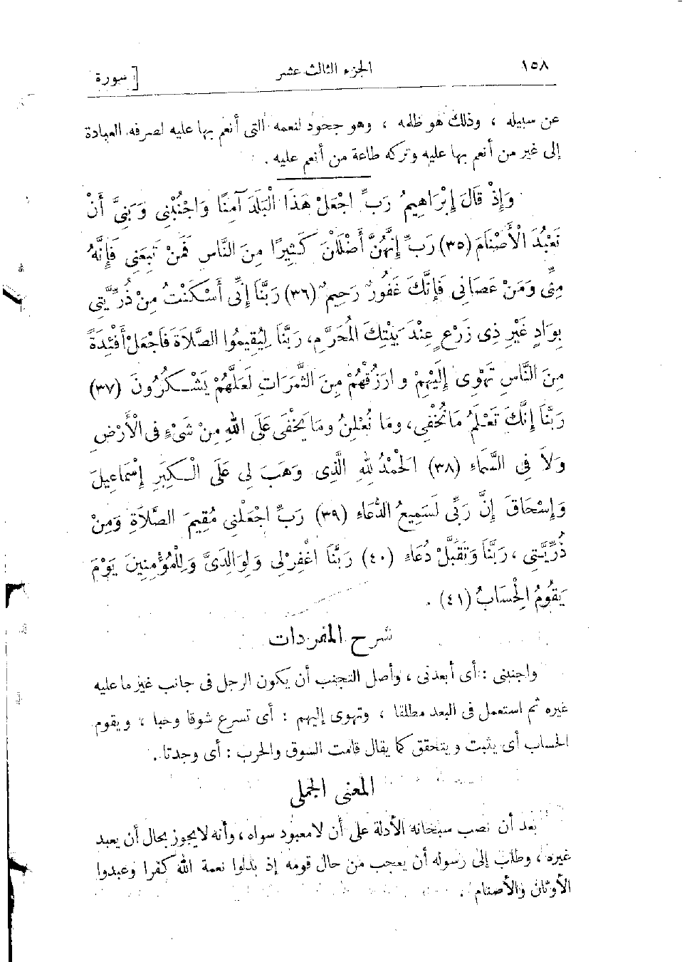 واجنبنى: أي أبعدنى، وأصل التجنب أن يكون الرجل فى جانب غير ما عليه غيره، ثم استعمل فى البعد مطلقا، وتهوى إليهم: أي تسرع شوقا وحبا، ويقوم الحساب: