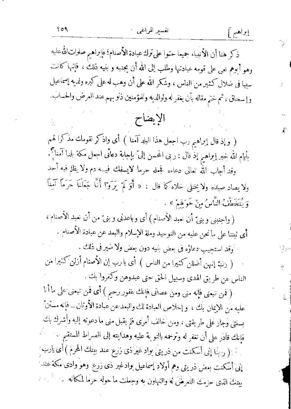 ذكر هنا أن الأنبياء جميعا حثوا على ترك عبادة الأصنام، فإبراهيم صلوات الله عليه وهو أبوهم نعى على قومه عبادتها، وطلب إلى الله أن يجنبه وبنيه ذلك، فإنها كانت سببا فى ضلال كثير من الناس، وشكر الله على أن وهب له على كبره ولديه إسماعيل وإسحاق، ثم ختم مقاله بأن يغفر له ولوالديه وللمؤمنين ذنوبهم عند العرض والحساب.