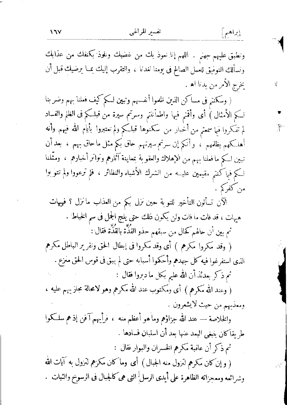 (وَسَكَنْتُمْ فِي مَساكِنِ الَّذِينَ ظَلَمُوا أَنْفُسَهُمْ وَتَبَيَّنَ لَكُمْ كَيْفَ فَعَلْنا بِهِمْ وَضَرَبْنا لَكُمُ الْأَمْثالَ) أي وأقمتم فيها واطمأننتم وسرتم سيرة من قبلكم فى الظلم والفساد، لم تفكروا فيما سمعتم من أخبار من سكنوها قبلكم ولم تعتبروا بأيام الله فيهم وأنه أهلكهم بظلمهم، وأنكم إن سرتم سيرتهم حاق بكم مثل ما حاق بهم، بعد أن تبين لكم ما فعلنا بهم من الإهلاك والعقوبة بمعاينة آثارهم وتواتر أخبارهم، ومثلنا لكم فيما كنتم مقيمين عليه من الشرك الأشباه والنظائر، فلم ترعووا ولم تتوبوا من كفركم.