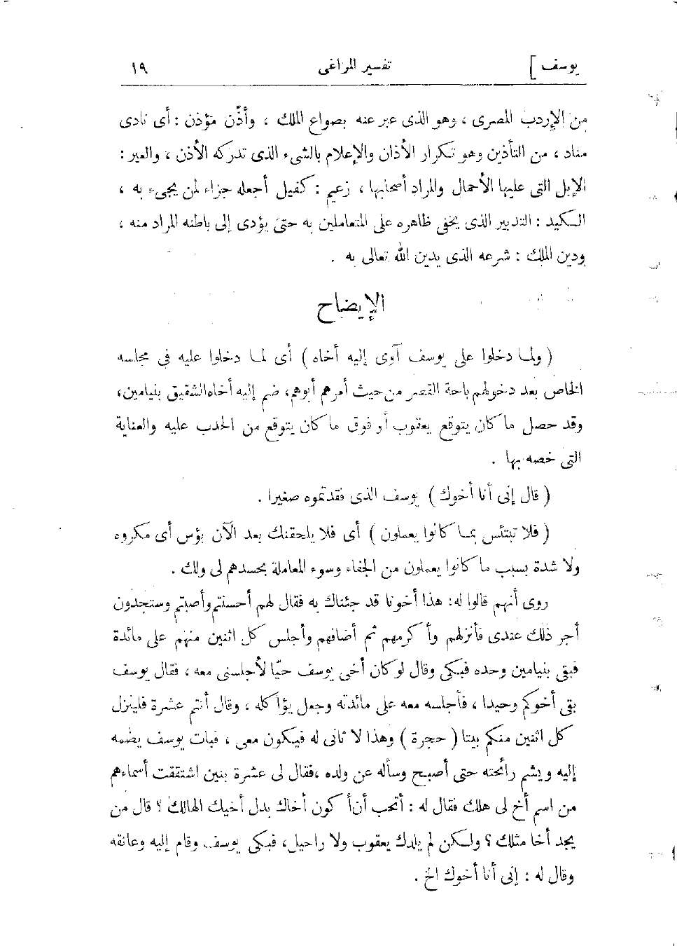 روى أنهم قالوا له: هذا أخونا قد جئناك به، فقال لهم أحسنتم وأصبتم، وستجدون أجر ذلك عندى، فأنزلهم وأكرمهم، ثم أضافهم وأجلس كل اثنين منهم على مائدة فبقى بنيامين وحده فبكى وقال لو كان أخى يوسف حيا لأجلسنى معه، فقال يوسف بقي أخوكم وحيدا، فأجلسه معه على مائدته وجعل يؤاكله، وقال أنتم عشرة فلينزل كل اثنين منكم بيتا (حجرة) وهذا لاثانى له فيكون معى، فبات يوسف يضمه إليه ويشمّ رائحته حتى أصبح وسأله عن ولده، فقال لى عشرة بنين اشتققت أسماءهم من اسم أخ لى هلك فقال له: أتحب أن أكون أخاك بدل أخيك الهالك؟ قال من يجد أخا مثلك؟ ولكن لم يلدك يعقوب ولا راحيل، فبكى يوسف وقام إليه وعانقه وقال له: إنى أنا أخوك إلخ.