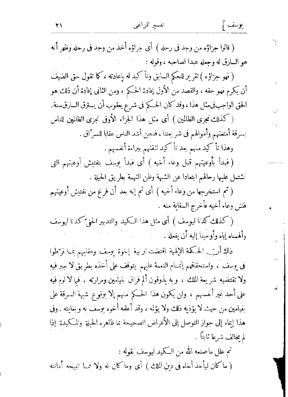 ذلك أن الحكمة الإلهية اقتضت تربية إخوة يوسف وعقابهم بما فرطوا فى يوسف واستحقاقهم إتمام النعمة عليهم يتوقف على أخذه بطريق لا جبر فيه ولا تقتضيه شريعة الملك، وبه يذوقون ألم فراق بنيامين ومرارته، فيما لا لوم فيه على أحد غير أنفسهم، ولن يكون هذا الحكم منهم إلا بوقوع شبهة السرقة على بنيامين من حيث لا يؤذيه ذلك ولا يؤلمه، وقد أعلمه أخوه يوسف به وبغايته. وفى هذا إيماء إلى جواز التوصل إلى الأغراض الصحيحة بما ظاهره الحيلة والمكيدة إذا لم يخالف شرعا ثابتا.