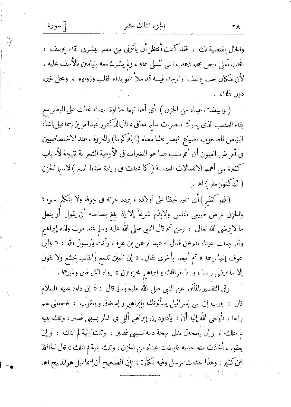 (وَابْيَضَّتْ عَيْناهُ مِنَ الْحُزْنِ) أي أصابتهما غشاوة بيضاء غطت على البصر مع بقاء العصب الذي يدرك المبصرات سليما معافى، قال الدكتور عبد العزيز إسماعيل باشا: