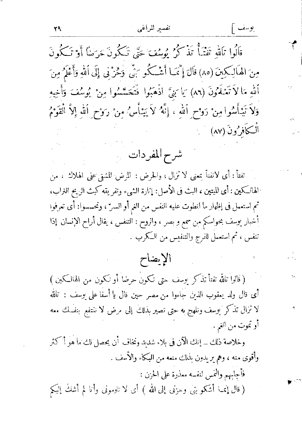 تفتأ: أي لا تفتأ بمعنى لا تزال. والحرض: المرض المشفى على الهلاك، من الهالكين: أي الميتين، البث فى الأصل: إثارة الشيء وتفريقه كبث الريح التراب، ثم استعمل فى إظهار ما انطوت عليه النفس من الغم أو السر، وتحسسوا: أي تعرفوا أخبار يوسف بحواسكم من سمع وبصر، والرّوح: التنفس، يقال أراح الإنسان إذا تنفس، ثم استعمل للفرج والتنفيس من الكرب.