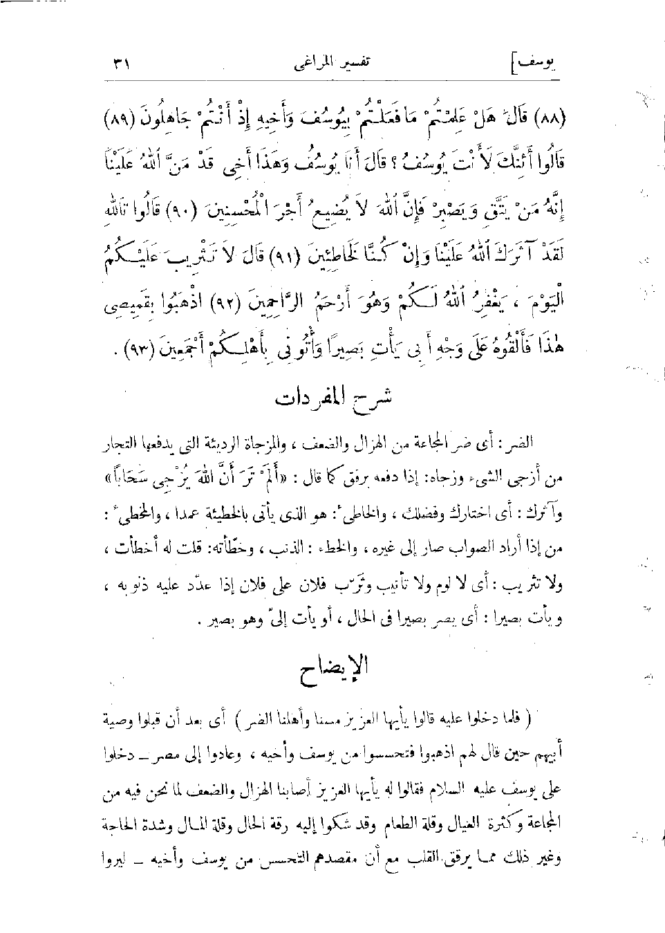الضر: أي ضر المجاعة من الهزال والضعف، والمزجاة: الرديئة التي يدفعها التجار من أزجى الشيء وزجاه: إذا دفعه برفق كما قال: «أَلَمْ تَرَ أَنَّ اللَّهَ يُزْجِي سَحاباً» وآثرك: أي اختارك وفضلك، والخاطئ: هو الذي يأتى بالخطيئة عمدا، والمخطئ: