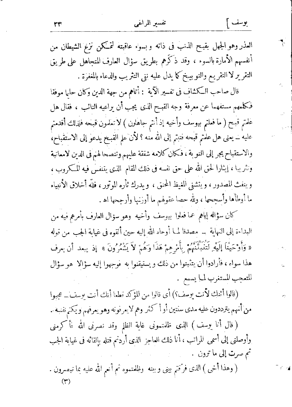 قال صاحب الكشاف فى تفسير الآية: أتاهم من جهة الدين وكان حليما موفقا، فكلمهم مستفهما عن معرفة وجه القبح الذي يجب أن يراعيه التائب «فقال هل علمتم» قبح «ما فعلتم بيوسف وأخيه إذ أنتم جاهلون» لا تعلمون قبحه، فلذلك أقدمتم عليه يعنى هل علمتم قبحه فتبتم إلى الله منه؟ لأن علم القبح يدعو إلى الاستقباح، والاستقباح يجر إلى التوبة، فكان كلامه شفقة عليهم وتنصحا لهم فى الدين لا معاتبة وتثريبا، إيثارا لحق الله على حق نفسه فى ذلك المقال الذي يتنفس فيه المكروب، وينفث المصدور، ويتشفى المغيظ المحنق، ويدرك ثأره الموتور فلله أخلاق الأنبياء ما أوطأها وأسجحها، ولله حصا عقولهم ما أوزنها وأرجحها اه.