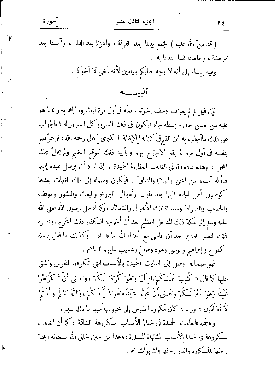 فهو سبحانه يوصّل إلى الغايات الحميدة بالأسباب التي تكرهها النفوس وتشق عليها كما قال «كُتِبَ عَلَيْكُمُ الْقِتالُ وَهُوَ كُرْهٌ لَكُمْ، وَعَسى أَنْ تَكْرَهُوا شَيْئاً وَهُوَ خَيْرٌ لَكُمْ، وَعَسى أَنْ تُحِبُّوا شَيْئاً وَهُوَ شَرٌّ لَكُمْ، وَاللَّهُ يَعْلَمُ وَأَنْتُمْ لا تَعْلَمُونَ» وربما كان مكروه النفوس إلى محبوبها سببا ما مثله سبب.