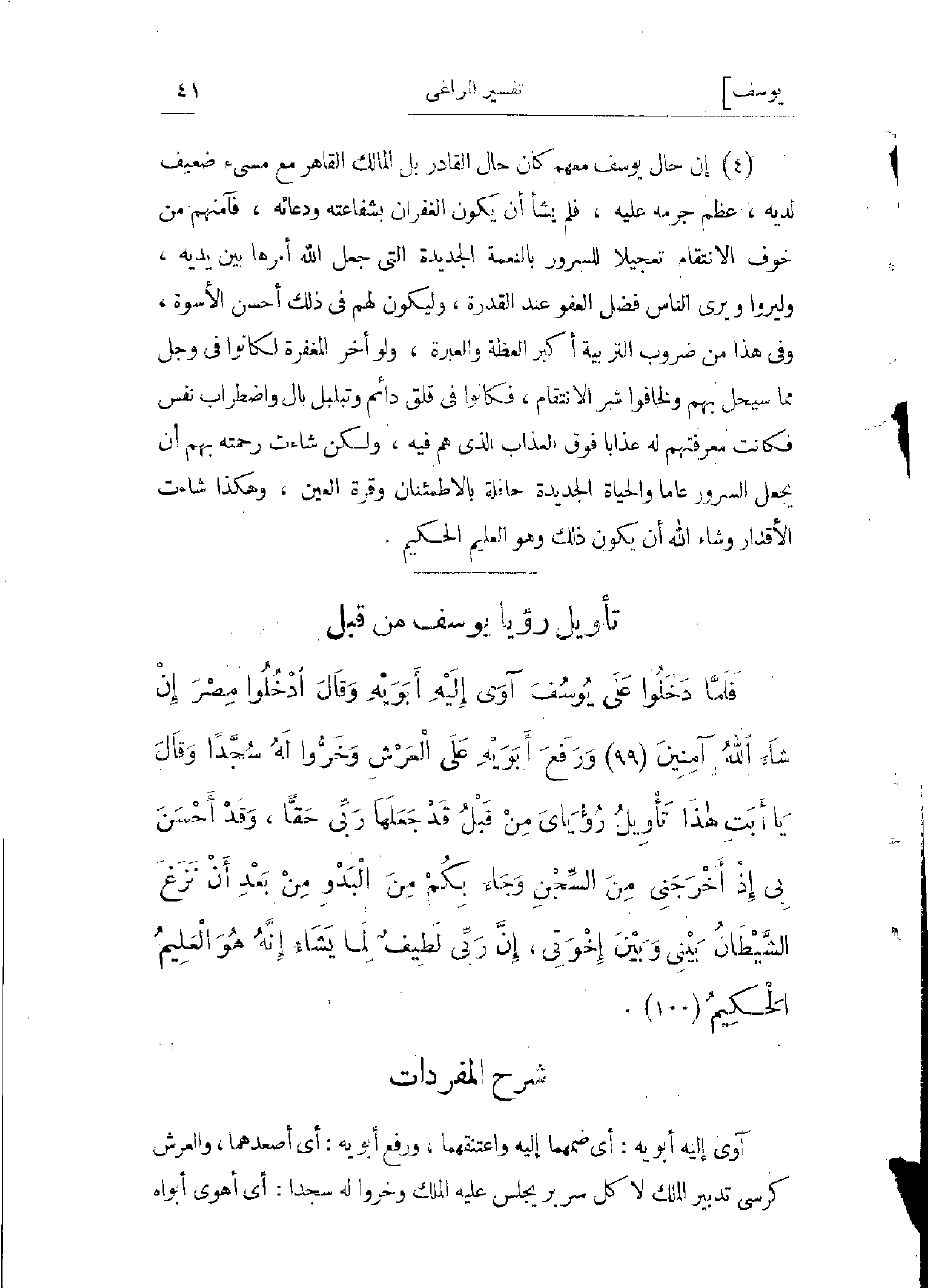 (4) إن حال يوسف معهم كان حال القادر بل المالك القاهر مع مسىء ضعيف لديه، عظم جرمه عليه، فلم يشأ أن يكون الغفران بشفاعته ودعائه، فآمنهم من خوف الانتقام تعجيلا للسرور بالنعمة الجديدة التي جعل الله أمرها بين يديه، وليروا ويرى الناس فضل العفو عند القدرة، وليكون لهم فى ذلك أحسن الأسوة، وفى هذا من ضروب التربية أكبر العظة، ولو أخر المغفرة لكانوا فى وجل مما سيحلّ بهم، ولخافوا شر الانتقام، فكانوا فى قلق دائم وتبلبل بال واضطراب نفس، فكان توجسهم له عذابا فوق العذاب الذي هم فيه، ولكن شاءت رحمته بهم أن يجعل السرور عاما والحياة الجديدة حافلة بالاطمئنان وقرة العين، وهكذا شاءت الأقدار وشاء الله أن يكون ذلك وهو العليم الحكيم.