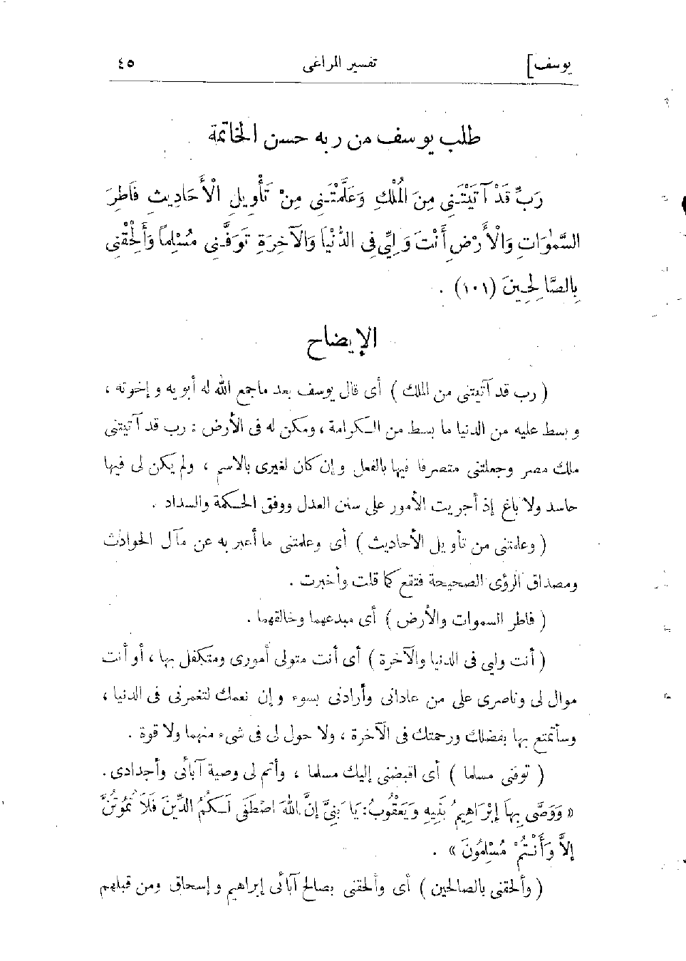 (رَبِّ قَدْ آتَيْتَنِي مِنَ الْمُلْكِ) أي قال يوسف بعد ما جمع الله له أبويه وإخوته، وبسط له من الدنيا ما بسط من الكرامة، ومكن له فى الأرض: رب قد آتيتني ملك مصر وجعلتنى متصرفا فيها بالفعل وإن كان لغيرى بالاسم، ولم يكن لى فيها حاسد ولا باغ إذ أجريت الأمور على سنن العدل ووفق الحكمة والسداد.