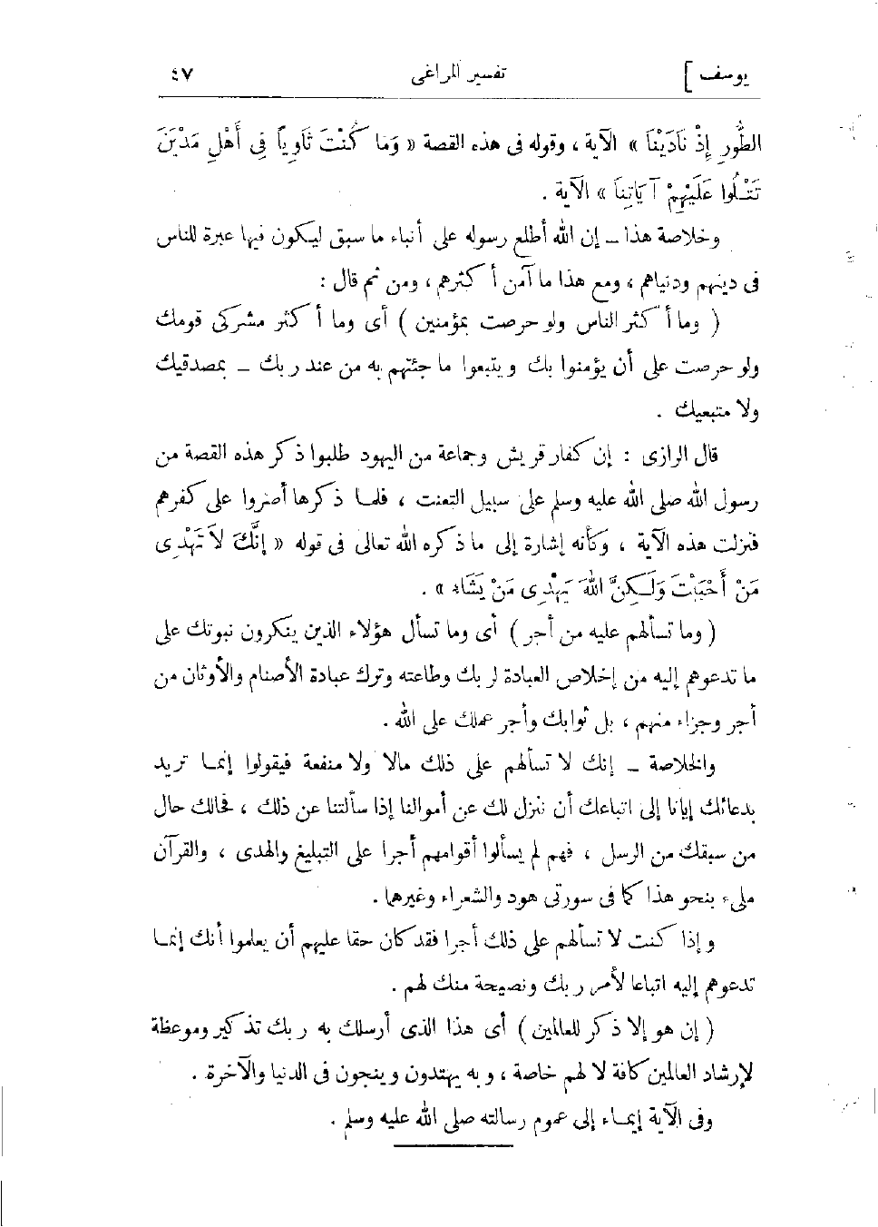 والخلاصة- إنك لا تسألهم على ذلك ما لا ولا منفعة فيقولوا إنما تريد بدعائك إيانا إلى اتباعك أن ننزل لك عن أموالنا إذا سألتنا عن ذلك، فحالك حال من سبقك من الرسل، فهم لم يسألوا أقوامهم أجرا على التبليغ والهدى، والقرآن ملىء بنحو هذا كما فى سورتى هود والشعراء وغيرهما.