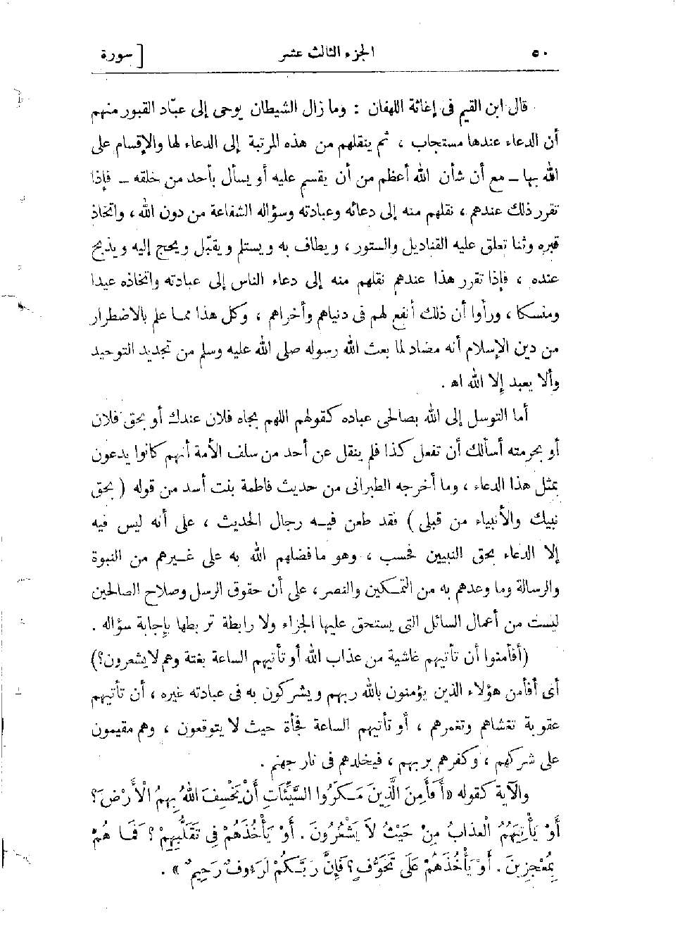 أن الدعاء عندها مستجاب، ثم ينقلهم من هذه المرتبة إلى الدعاء لها والإقسام على الله بها مع أن شأن الله أعظم من أن يقسم عليه أو يسأل بأحد من خلقه- فإذا تقرر ذلك عندهم، نقلهم منه إلى دعائه وعبادته وسؤاله الشفاعة من دون الله، واتخاذ قبره وثنا تعلق عليه القناديل والستور، ويطاف به ويستلم ويقبّل ويحجّ إليه ويذبح عنده، فإذا تقرر هذا عندهم نقلهم منه إلى دعاء الناس إلى عبادته واتخاذه عيدا ومنسكا، ورأوا أن ذلك أنفع لهم فى دنياهم وأخراهم، وكل هذا مما علم بالاضطرار من دين الإسلام أنه مضاد لما بعث الله رسوله صلى الله عليه وسلم من تجديد التوحيد وألا بعبد إلا الله اه.
