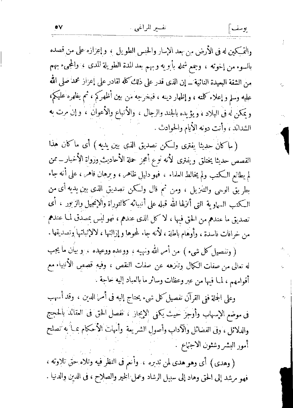 (ما كانَ حَدِيثاً يُفْتَرى وَلكِنْ تَصْدِيقَ الَّذِي بَيْنَ يَدَيْهِ) أي ما كان هذا القصص حديثا يختلق ويفترى، لأنه نوع أعجز حملة الأحاديث ورواة الأخبار- ممن لم يطالع الكتب ولم يخالط العلماء، فهو دليل ظاهر، وبرهان قاهر، على أنه جاء بطريق الوحى والتنزيل. ومن ثم قال ولكن تصديق الذي بين يديه أي من الكتب السماوية التي أنزلها الله قبله على أنبيائه كالتوراة والإنجيل والزبور، أي تصديق ما عندهم من الحق فيها، لا كل الذي عندهم، فهو ليس بمصدّق لما عندهم من خرافات فاسدة، وأوهام باطلة، لأنه جاء لمحوها وإزالتها، لا لإثباتها وتصديقها.