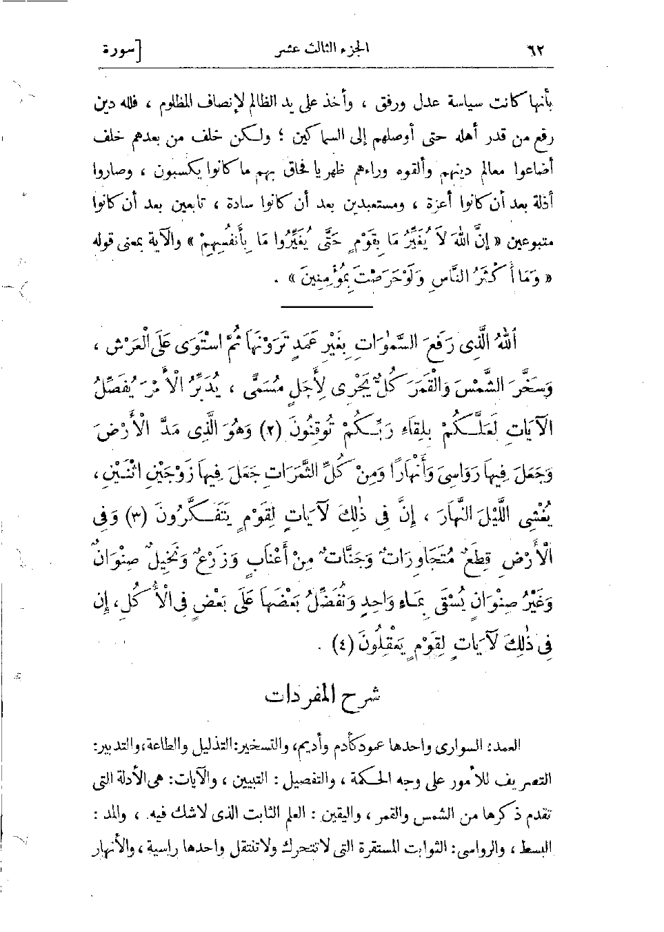 إلى السماكين، ولكن خلف من بعدهم خلف أضاعوا معالمه، وألقوها وراءهم ظهريا فحاق بهم ما كانوا يكسبون، وصاروا أذلة بعد أن كانوا أعزة، ومستعبدين بعد أن كانوا سادة، تابعين بعد أن كانوا متبوعين «إِنَّ اللَّهَ لا يُغَيِّرُ ما بِقَوْمٍ حَتَّى يُغَيِّرُوا ما بِأَنْفُسِهِمْ» والآية بمعنى قوله: «وَما أَكْثَرُ النَّاسِ وَلَوْ حَرَصْتَ بِمُؤْمِنِينَ» .