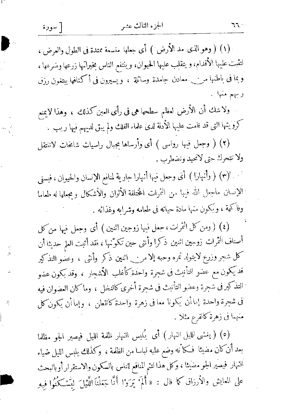 (1) (وَهُوَ الَّذِي مَدَّ الْأَرْضَ) أي جعلها متسعة ممتدة فى الطول والعرض، لتثبت عليها الأقدام، ويتقلب عليها الحيوان، وينتفع الناس بخيراتها زرعها وضرعها، وبما فى باطنها من معادن جامدة وسائلة، ويسيرون فى أكنافها يبتعون رزق ربهم منها.