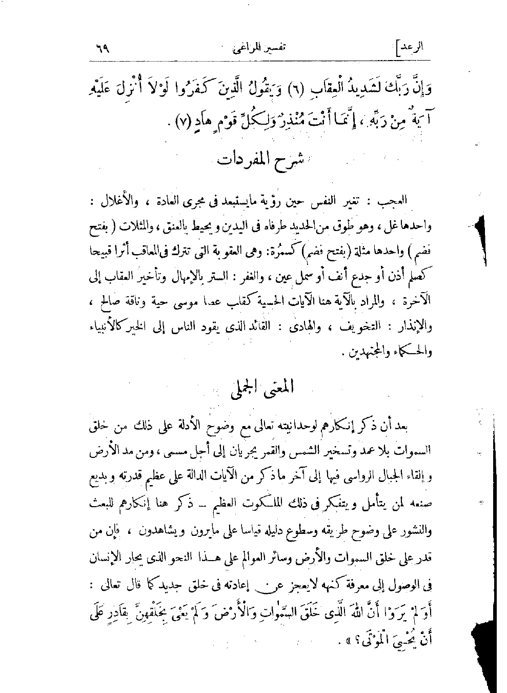 العجب: تغير النفس حين رؤية ما يستبعد فى مجرى العادة، والأغلال: واحدها غلّ، وهو طوق من الحديد طرفاه فى اليدين ويحيط بالعنق، والمثلات (بفتح فضم) واحدها مثلة (بفتح فضم) كسرة وهى العقوبة التي تترك فى المعاقب أثرا قبيحا كصلم أذن أو جدع أنف أو سمل عين، والغفر: الستر بالإمهال وتأخير العقاب إلى الآخرة، والمراد بالآية هنا الآيات الحسية كقلب عصا موسى حية وناقة صالح، والإنذار: